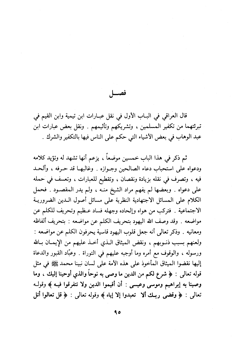 قال العراقي في الباب الأول في نقل عبارات ابن تيمية وابن القيم في تبرئتهما من تكفير المسلمين، وتشريكهم وتأثيمهم، ونقل بعض عبارات ابن عبد الوهاب في بعض الأشياء التي حكم على الناس فيها بالتكفير والشرك.