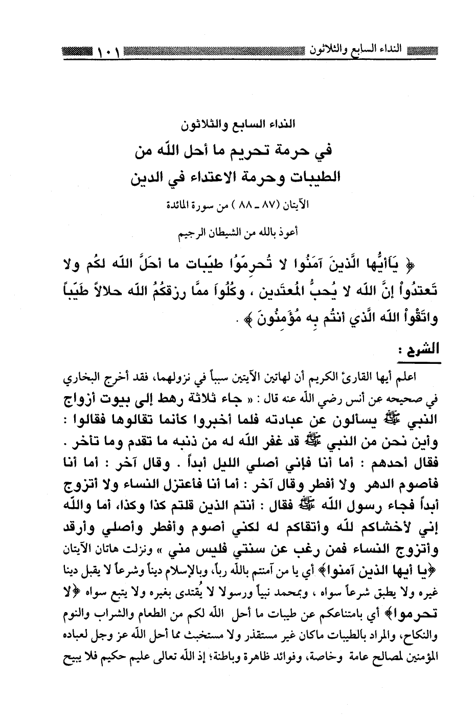 النداء السابع والثلاثون: في حرمة تحريم ما احل الله من الطيبات وحرمة الاعتداء في الدين
