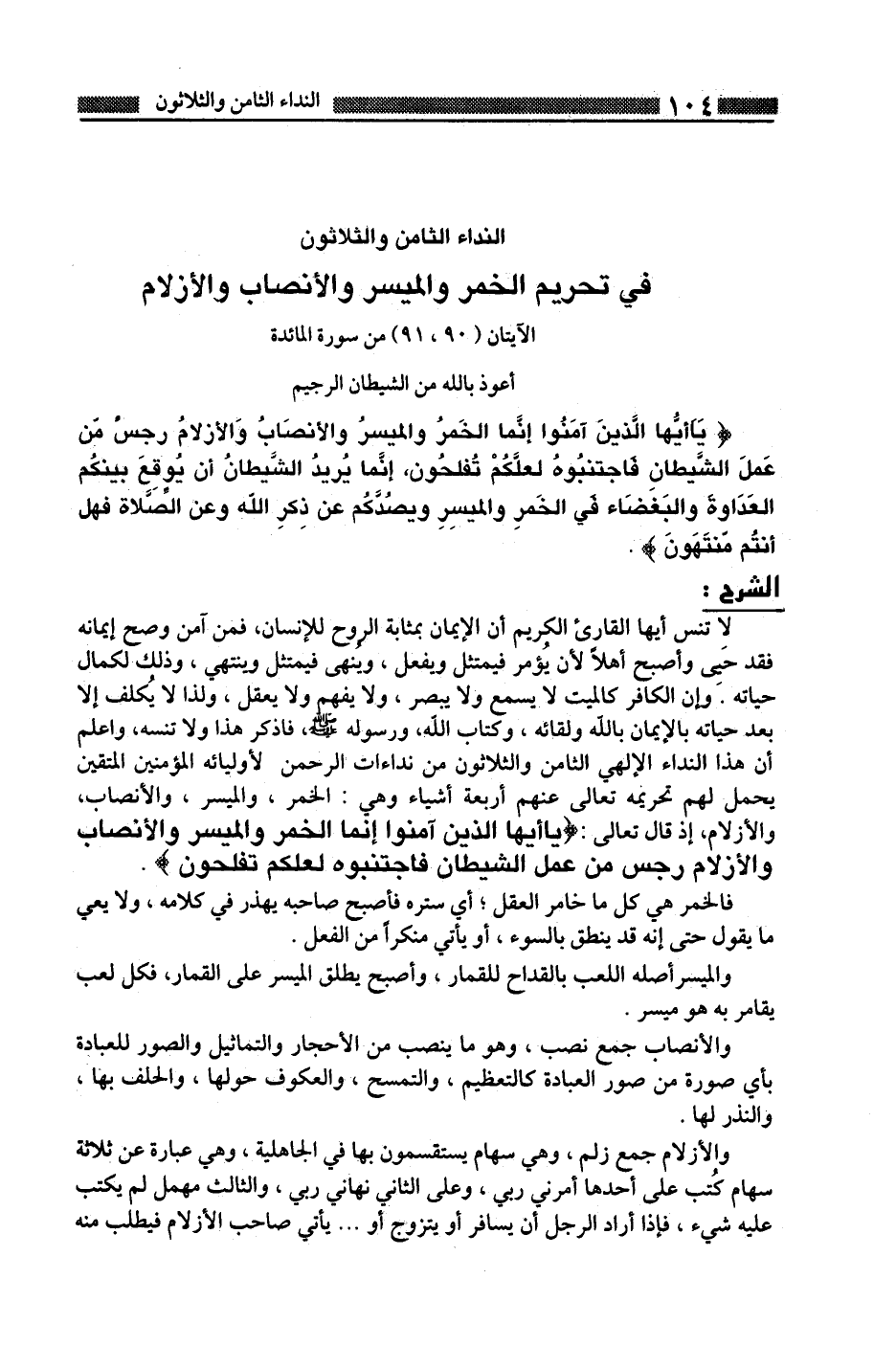 لا تنس أيها القارئ الكريم أن الإيمان بمثابة الروح للإنسان، فمن آمن وصح إيمانه فقد حيى وأصبح أهلا لأن يؤمر فيمتثل ويفعل، وينهى فيمتثل وينتهى، وذلك لكمال حياته. وإن الكافر كالميت لا يسمع ولا يبصر، ولا يفهم ولا يعقل، ولذا لا يكلف إلا بعد حياته بالإيمان بالله ولقائه، وكتاب الله، ورسوله صلى الله عليه وسلم، فاذكر هذا ولا تنسه، واعلم أن هذا النداء الإلهي الثامن والثلاثون من نداءات الرحمن لأوليائه المؤمنين المتقين يحمل لهم تحريمه تعالى عنهم أربعة أشياء وهى: الخمر، والميسر، والأنصاب، والأزلام، إذ قال تعالى: {يَا أَيُّهَا الَّذِينَ آمَنُوا إِنَّمَا الْخَمْرُ وَالْمَيْسِرُ وَالْأَنْصَابُ وَالْأَزْلامُ رِجْسٌ مِنْ عَمَلِ الشَّيْطَانِ فَاجْتَنِبُوهُ لَعَلَّكُمْ تُفْلِحُونَ} .