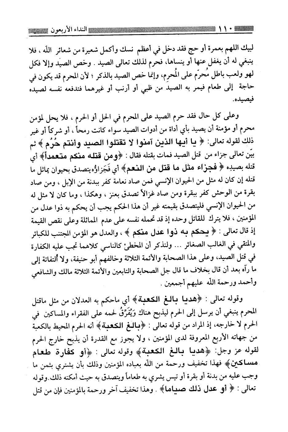 وعلى كل حال فقد حرم الصيد على المحرم في الحل أو الحرم، فلا يحل لمؤمن محرم أو مؤمنة أن يصيد بأي أداة من أدوات الصيد سواء كان رمحا، أو شركا أو غير ذلك لقوله تعالى: {يَا أَيُّهَا الَّذِينَ آمَنُوا لا تَقْتُلُوا الصَّيْدَ وَأَنْتُمْ حُرُمٌ} ثم بين تعالى جزاء من قتل الصيد فمات بقتله فقال: {وَمَنْ قَتَلَهُ مِنْكُمْ مُتَعَمِّداً} أي قتله بيده {فَجَزَاءٌ مِثْلُ مَا قَتَلَ مِنَ النَّعَمِ} أي فجزاؤه أن يتصدق بحيوان يماثل ما قتله إن كان له مثل من الحيوان الإنسي فمن صاد نعامة كفر ببدنة من الإبل، ومن صاد بقرة من الوحش كفر ببقرة ومن صاد غزالا تصدق بعنز، وهكذا، وما كان لا مثل له من الحيوان الإنسي فليتصدق بقيمته غير أن هذا الحكم يجب أن يحكم به ذوا عدل من المؤمنين، فلا يترك للقاتل وحده إذ قد تحمله نفسه على عدم المماثلة وعلى نقص القيمة إذ قال تعالى: {يَحْكُمُ بِهِ ذَوَا عَدْلٍ مِنْكُمْ} ، والعدل هو المؤمن المجتنب للكبائر والمتقى في الغالب الصغائر… ولنذكر أن المخطئ كالناسي كلاهما تجب عليه الكفارة في قتل الصيد، وعلى هذا الصحابة والأئمة الثلاثة وخالفهم أبو حنيفة، ولا إلتفاتة إلى ما رآه بعد أن قال بخلاف ما قال جل الصحابة والتابعين والأئمة الثلاثة مالك والشافعي وأحمد ورحمة الله عليهم أجمعين.