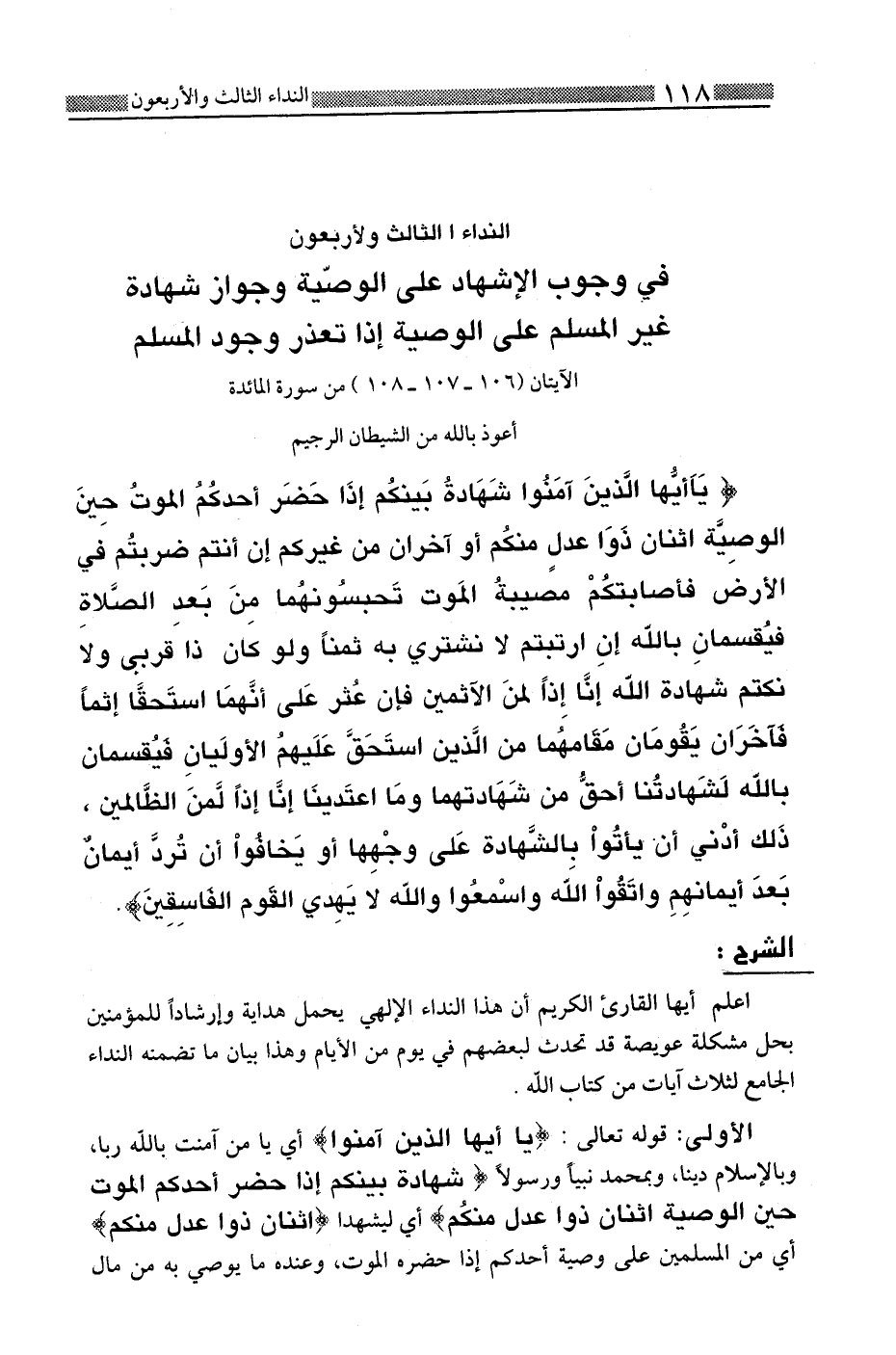النداء الثالث والأربعون: في وجوب الإشهاد على الوصية وجواز شهادة غير المسلم على الوصية إذا تعذر وجود المسلم