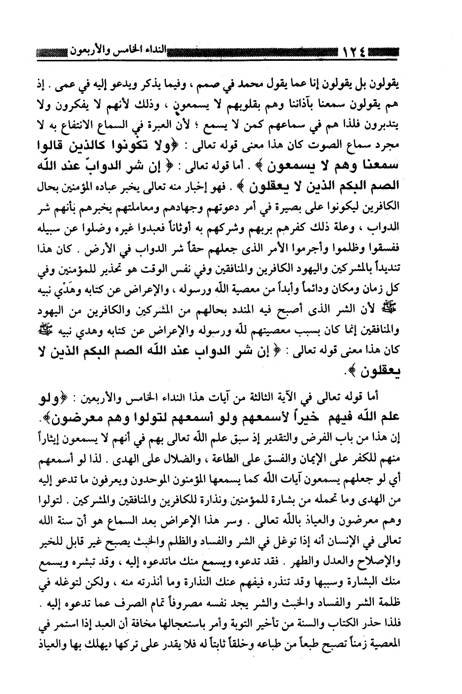 أما قوله تعالى في الآية الثالثة من آيات هذا النداء الخامس والأربعين: {وَلَوْ عَلِمَ اللَّهُ فِيهِمْ خَيْراً لَأسْمَعَهُمْ وَلَوْ أَسْمَعَهُمْ لَتَوَلَّوْا وَهُمْ مُعْرِضُونَ} . إن هذا النداء من باب الفرض والتقدير إذ سبق علم الله تعالى بهم في أنهم لا يسمعون إيثارا منهم للكفر على الإيمان والفسق على الطاعة، والضلال على الهدى. لذا لو أسمعهم أي لو جعلهم يسمعون آيات الله كما يسمعها المؤمنون الموحدون ويعرفون ما تدعو إليه من الهدى وما تحمله من بشارة للمؤمنين ونذارة للكافرين والمنافقين والمشركين. لتولوا وهم معرضون والعياذ بالله تعالى. وسر هذا الإعراض بعد السماع هو أن سنة الله تعالى في الإنسان أنه إذا توغل في الشر والفساد والظلم والخبث يصبح غير قابل للخير والإصلاح والعدل والطهر. فقد تدعوه ويسمع منك ما تدعوه إليه، وقد تبشره ويسمع منك البشارة وسببها وقد تنذره فيفهم عنك النذارة وما أنذرته منه، ولكن لتوغله في ظلمه الشر والفساد والخبث والشر يجد نفسه مصروفا تمام الصرف عما تدعوه إليه. فلذا حذر الكتاب والسنة من تأخير التوبة وأمر باستعجالها مخافة أن العبد إذا استمر في المعصية زمنا تصبح طبعا من طباعه وخلقا ثابتا له فلا يقدر على تركها فيهلك بها والعياذ