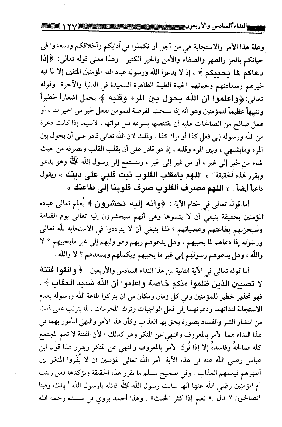 أما قوله تعالى في الآية الثانية من هذا النداء السادس والأربعين: {وَاتَّقُوا فِتْنَةً لا تُصِيبَنَّ الَّذِينَ ظَلَمُوا مِنْكُمْ خَاصَّةً وَاعْلَمُوا أَنَّ اللَّهَ شَدِيدُ الْعِقَابِ} . فهو تحذير خطير للمؤمنين وفى كل زمان ومكان من أن يتركوا طاعة الله ورسوله بعدم الاستجابة لندائهما ودعوتهما إلى فعل الواجبات وترك المحرمات، لما يترتب على ذلك من انتشار الشر والفساد بصورة يحق بها العذاب وكأن هذا الأمر والنهى المأمور بهما في هذا النداء هما الأمر بالمعروف والنهى عن المنكر وهو كذلك؛ لأن الفتنة لا تعم المجتمع كله صالحة وفاسدة إلا إذا ترك الأمر بالمعروف والنهى عن المنكر ويقرر هذا قول ابن عباس رضى الله عنه في هذه الآية: أمر الله تعالى المؤمنين أن لا يقرروا المنكر بين أظهرهم فيعمهم العذاب. وفى صحيح مسلم ما يقرر هذه الحقيقة ويؤكدها فعن زينب أم المؤمنين رضى الله عنها أنها سألت رسول الله صلى الله عليه وسلم قائلة يا رسول الله أنهلك وفينا الصالحون؟ قال: " نعم إذا كثر الخبيث ". وهذا أحمد يروى في مسنده رحمه الله