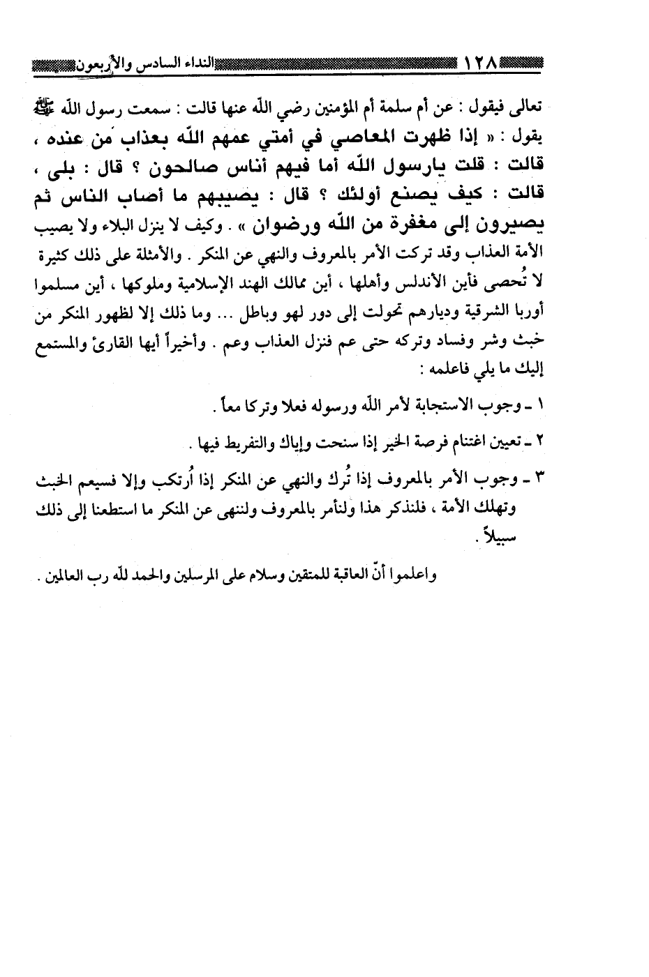 تعالى فيقول: عن أم سلمة أم المؤمنين رضى الله عنها قالت: سمعت رسول الله صلى الله عليه وسلم يقول: " إذا ظهرت المعاصي في أمتي عمهم الله بعذاب من عنده، قالت: قلت يا رسول الله أما فيهم أناس صالحون؟ قال: بلى، قالت: كيف يصنع أولئك؟ قال: يصيبهم ما أصاب الناس ثم يصيرون إلى مغفرة من الله ورضوان ". وكيف لا ينزل البلاء ولا يصيب الأمة العذاب وقد تركت الأمر بالمعروف والنهى عن المنكر. والأمثلة على ذلك كثيرة لا تحصى فأين الأندلس وأهلها، أين ممالك الهند الإسلامية وملوكها أين مسلموا أوربا الشرقية وديارهم تحولت إلى دور لهو وباطل… وما ذلك إلا لظهور المنكر من خبث وشر وفساد وتركه حتى عم فنزل العذاب وعم. وأخيرا أيها القارئ والمستمع إليك ما يلي فاعمله: