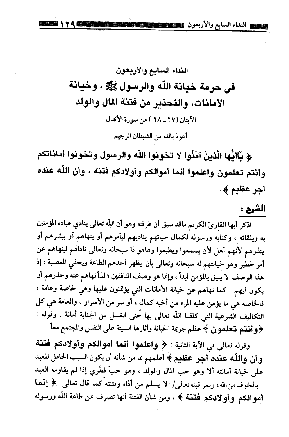 النداء السابع والأربعون: في حرمة خيانة الله والرسول صلى الله عليه سلم، وخيانة الأمانات، والتحذير من فتنة المال والولد