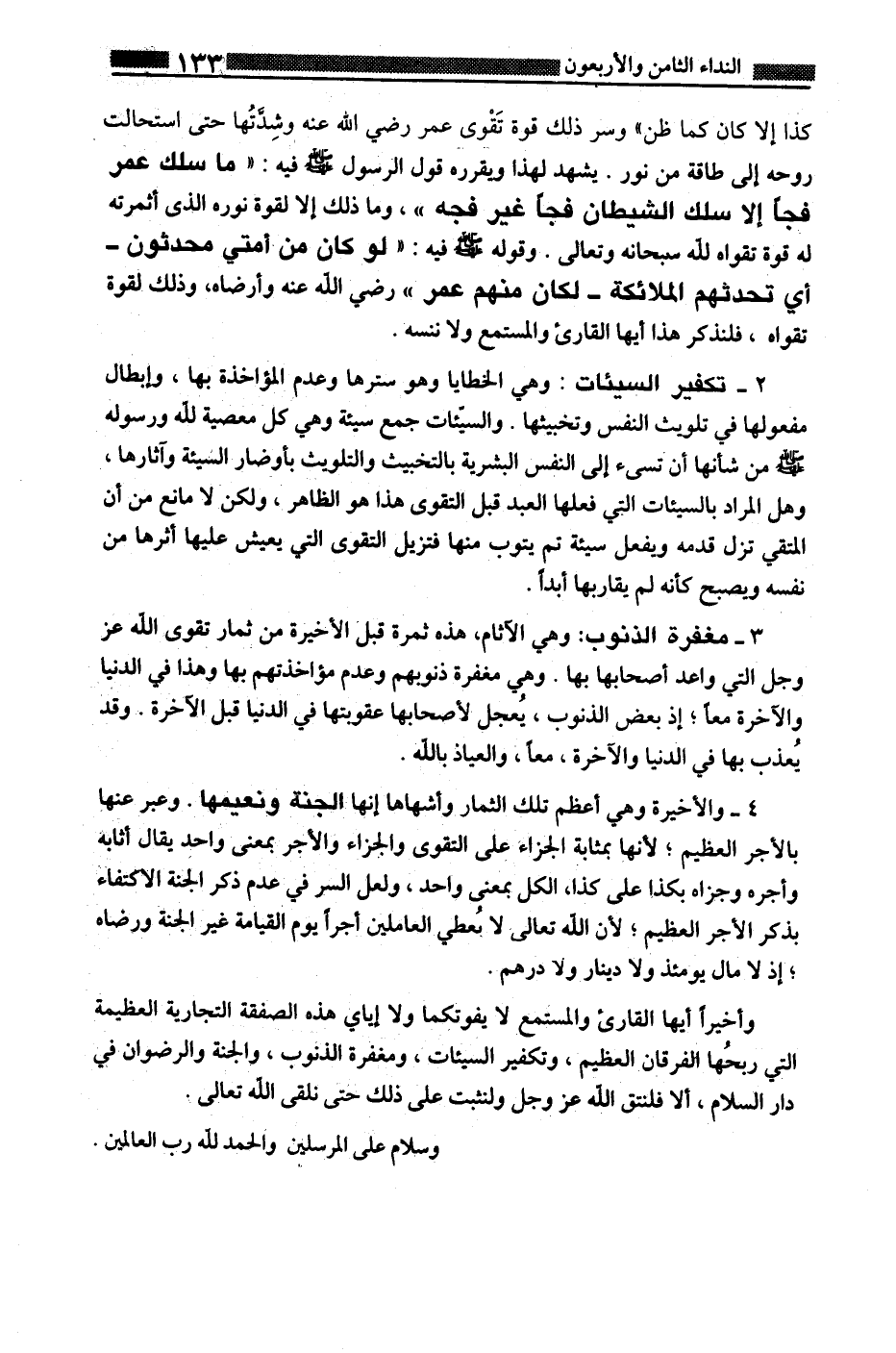 واخيرا أيها القارئ والمستمع لا يفوتكما ولا إياي هذه الصفقة التجارية العظيمة التي ربحها الفرقان العظيم، وتكفير السيئات، ومغفرة الذنوب، والجنة والرضوان في دار السلام، ألا فلنتق الله عز وجل ولنثبت على ذلك حتى تلقى الله تعالى.