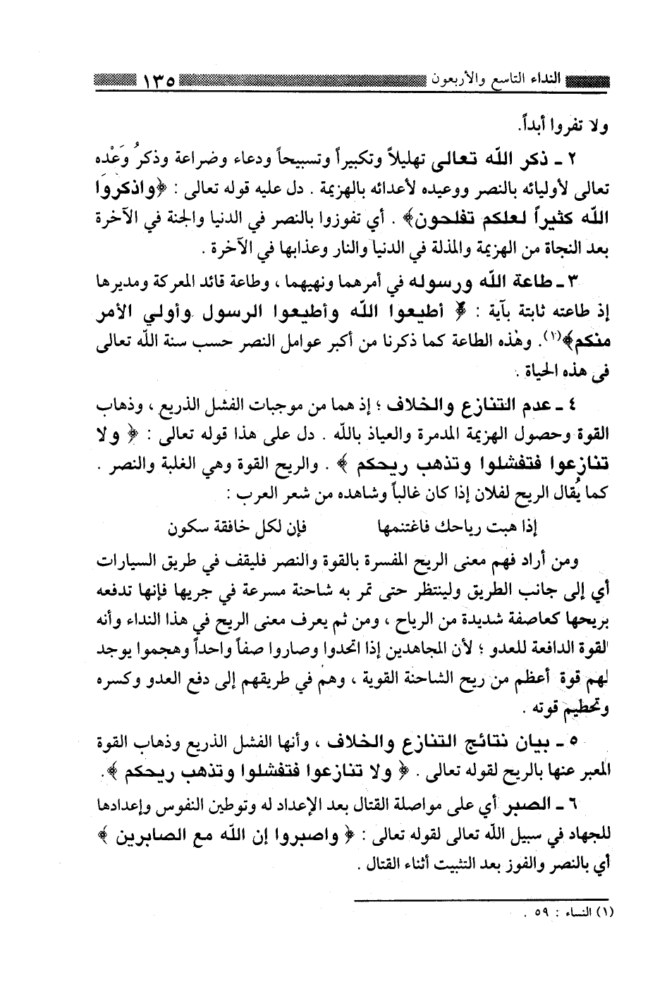 4-عدم التنازع والخلاف: إذ هما من موجبات الفشل الذريع وذهاب القوة وحصول الهزيمة المدمرة والعياذ بالله. دل على هذا قوله تعالى: {وَلا تَنَازَعُوا فَتَفْشَلُوا وَتَذْهَبَ رِيحُكُمْ} . والريح القوة وهي الغلبة والنصر. كما يقال الريح لفلان إذا كان غالبا وشاهده من شعر العرب: