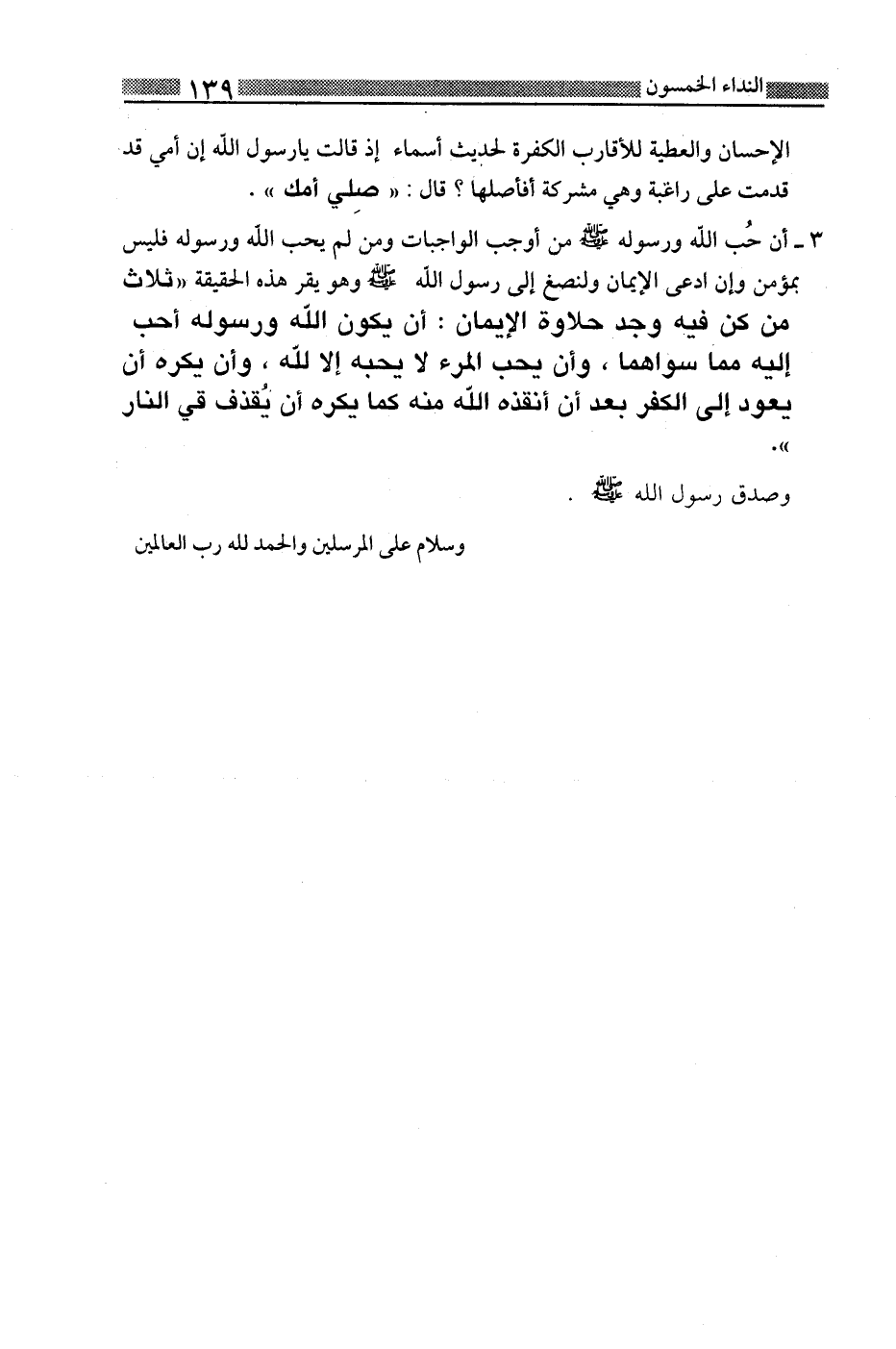 3-أن حب الله ورسوله صلى الله عليه وسلم من أوجب الواجبات ومن لم يحب الله ورسوله فليس بمؤمن وإن ادعى الإيمان ولنصغ إلى رسول الله صلى الله عليه وسلم وهو يقر هذه الحقيقة " ثلاث من كن فيه وجد حلاوة الأيمان: أن يكون الله ورسوله أحب إليه مما سواهما، وأن يحب المرء لا يحبه إلا لله، وأن يكره أن يعود إلى الكفر بعد أن أنقذه الله منه كما يكره أن يقذف في النار".
