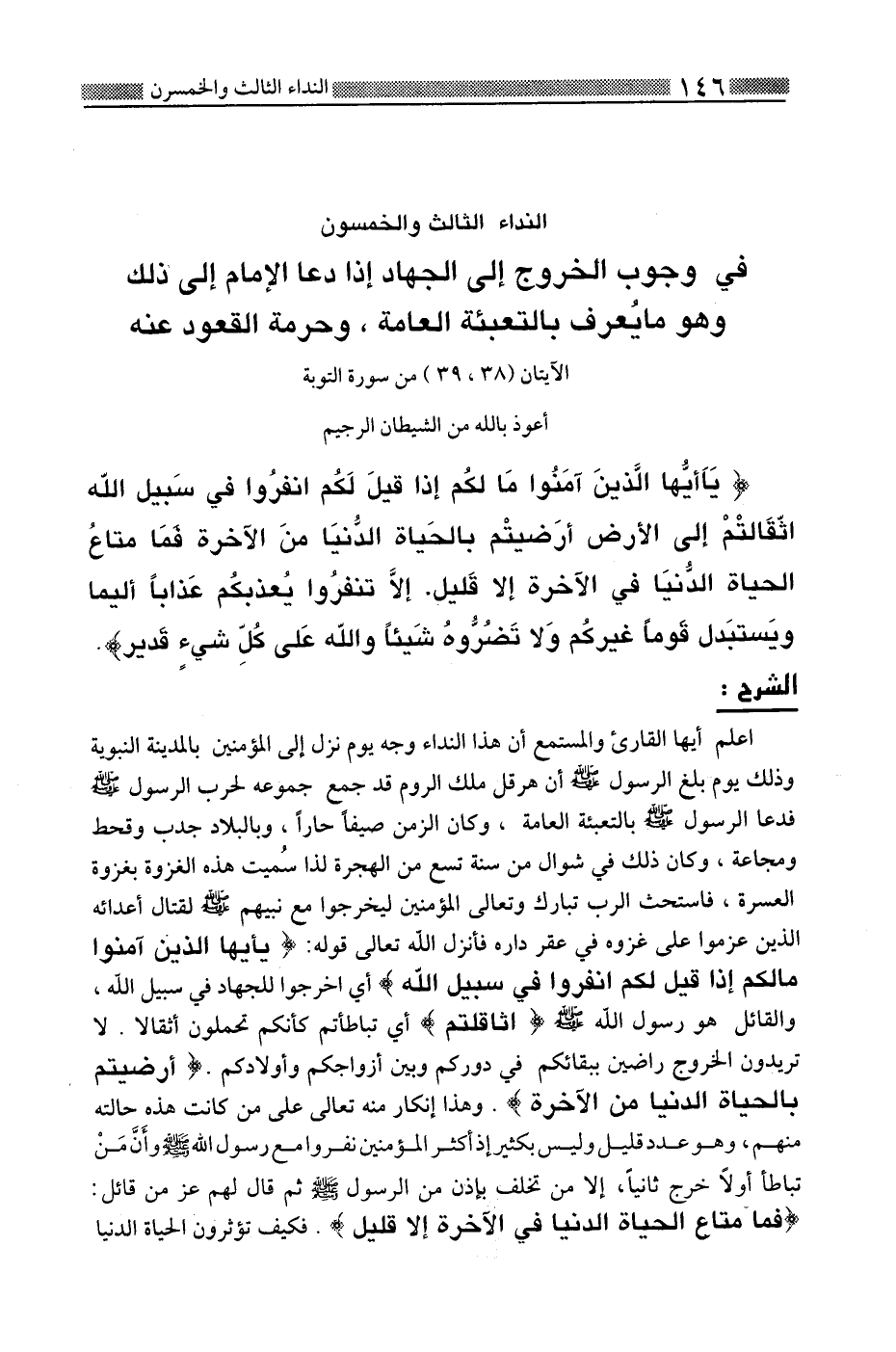 النداء الثالث الخمسون: في وجوب الخروج إلى الجهاد إذا دعا الإمام إلى ذلك وهو ما يعرف بالتعبئة العامة، وحرمة القعود عنه