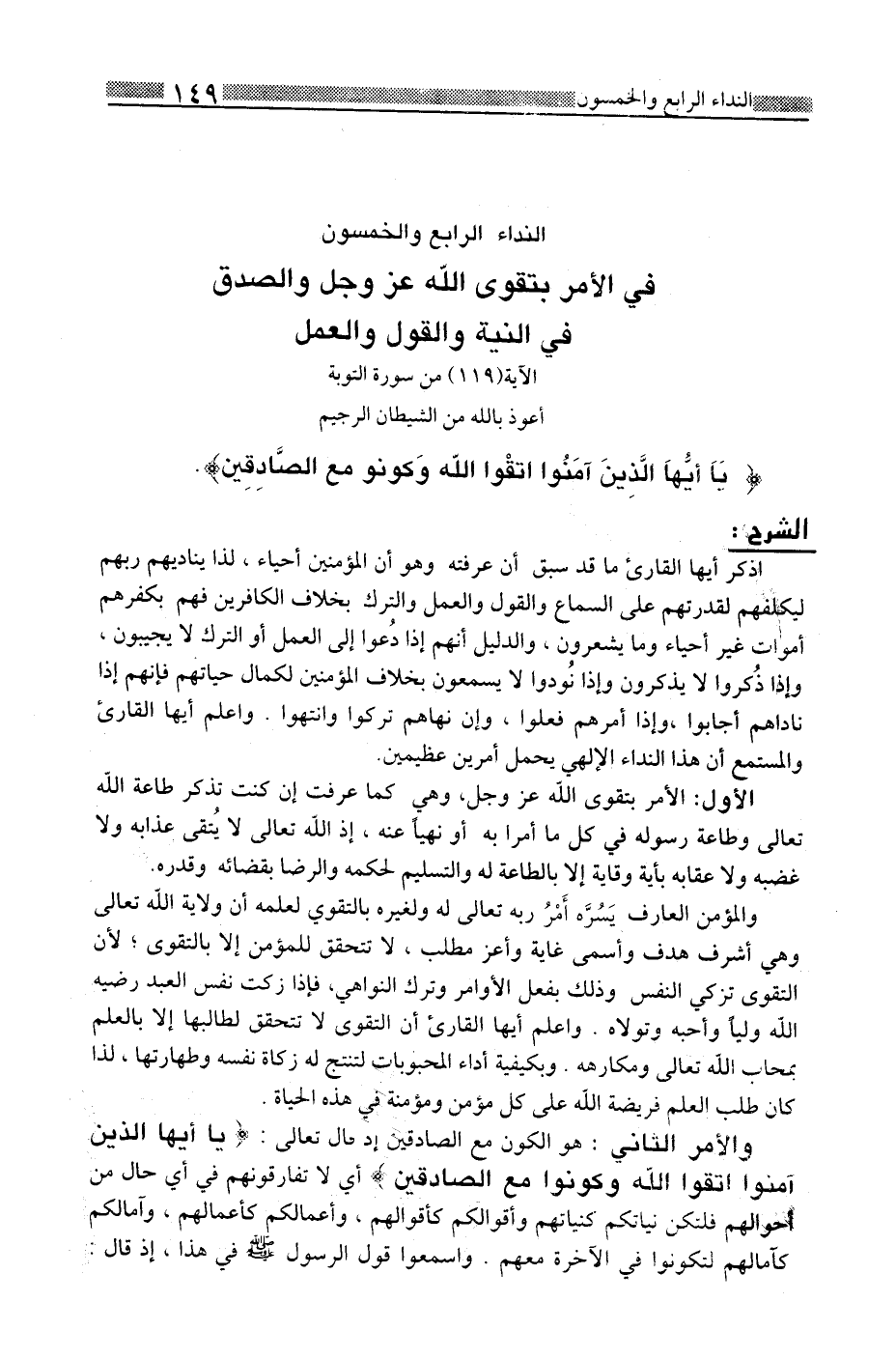 النداء الرابع الخمسون: في الأمر بتقوى الله عز وجل والصدق في النية والقول والعمل