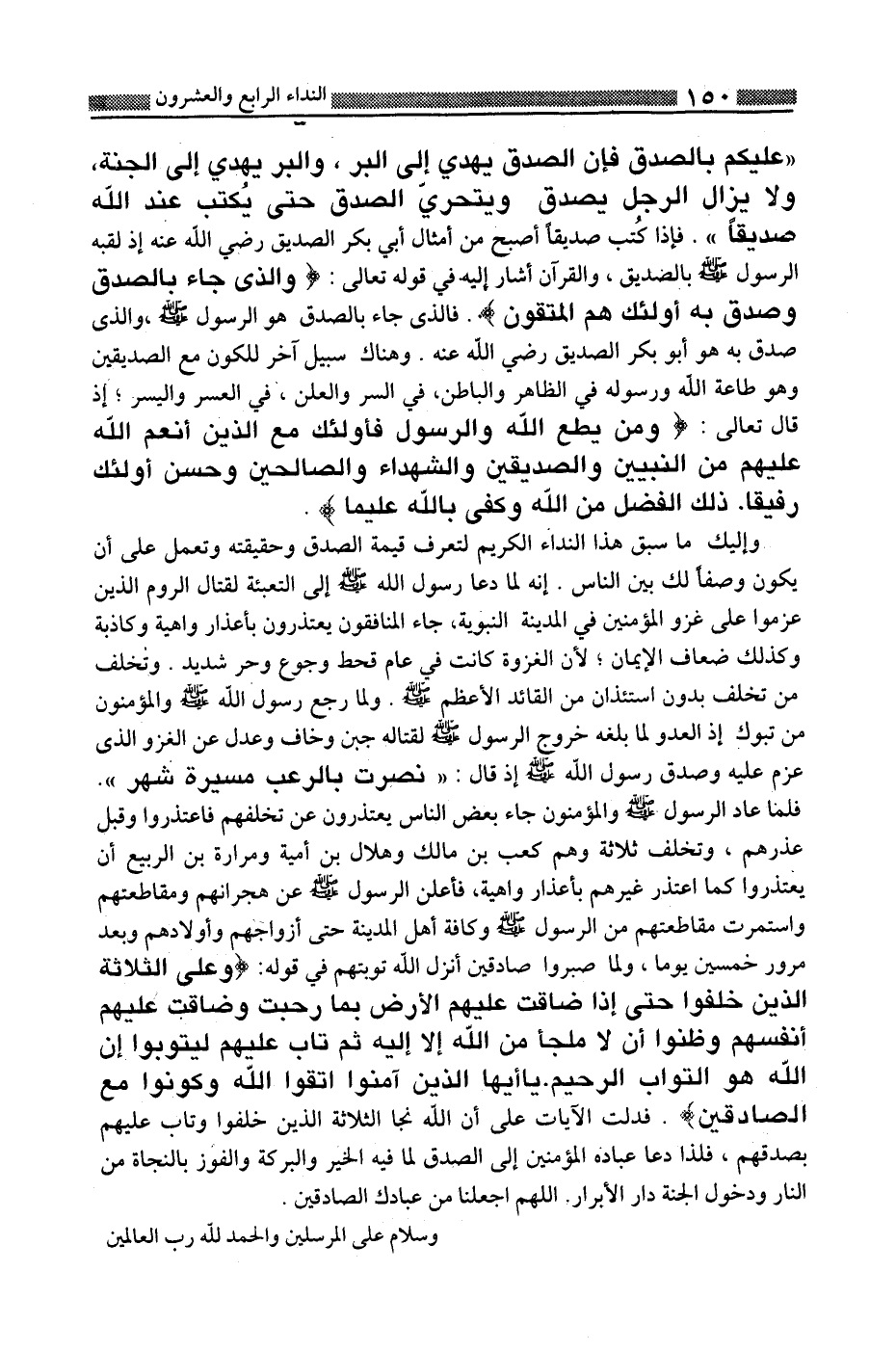 وإليك ما سبق هذا النداء الكريم لتعرف قيمة الصدق وحقيقته وتعمل على أن يكون وصفا لك بين الناس. إنه لما دعا رسول الله صلى الله عليه وسلم إلى التعبئة لقتال الروم الذين عزموا على غزو المؤمنين في المدينة النبوية، جاء المنافقون يعتذرون بأعذار واهية وكاذبة وكذلك ضعاف الإيمان؛ لأن الغزوة كانت في عام قحط وجوع وحر شديد. وتخلف من تخلف بدون استئذان من القائد الأعظم صلى الله عليه وسلم. ولما رجع رسول الله صلى الله عليه وسلم والمؤمنون من تبوك إذ العدو لما بلغه خروج الرسول صلى الله عليه وسلم لقتاله جبن وخاف وعدل عن الغزو الذي عزم عليه وصدق رسول الله صلى الله عليه وسلم إذ قال: " نصرت بالرعب مسيرة شهر ". فلما عاد الرسول صلى الله عليه وسلم والمؤمنون جاء بعض الناس يعتذرون عن تخلفهم فاعتذروا وقبل عذرهم، وتخلف ثلاثة وهم كعب بن مالك، وهلال بن أمية، ومرارة بن الربيع أن يعتذروا كما أعتذر غيرهم بأعذار واهية، فأعلن الرسول صلى الله عليه وسلم عن هجرانهم ومقاطعتهم واستمرت مقاطعتهم من الرسول صلى الله عليه وسلم وكافة أهل المدينة حتى أزواجهم وأولادهم وبعد مرور خمسين يوما، ولما صبروا صادقين أنزل الله توبتهم في قوله: {وَعَلَى الثَّلاثَةِ الَّذِينَ خُلِّفُوا حَتَّى إِذَا ضَاقَتْ عَلَيْهِمُ الْأَرْضُ بِمَا رَحُبَتْ وَضَاقَتْ عَلَيْهِمْ أَنْفُسُهُمْ وَظَنُّوا أَنْ لا مَلْجَأَ مِنَ اللَّهِ إِلاَّ إِلَيْهِ ثُمَّ تَابَ عَلَيْهِمْ لِيَتُوبُوا إِنَّ اللَّهَ هُوَ التَّوَّابُ الرَّحِيمُ يَا أَيُّهَا الَّذِينَ آمَنُوا اتَّقُوا اللَّهَ وَكُونُوا مَعَ الصَّادِقِينَ} . فدلت الآيات على أن الله نجا الثلاثة الذين خلفوا وتاب الله عليهم بصدقهم، فلذا دعا عباده المؤمنين إلى الصدق لما فيه الخير والبركة والفوز بالنجاة من النار ودخول الجنة دار الأبرار. اللهم اجعلنا من عبادك الصادقين.