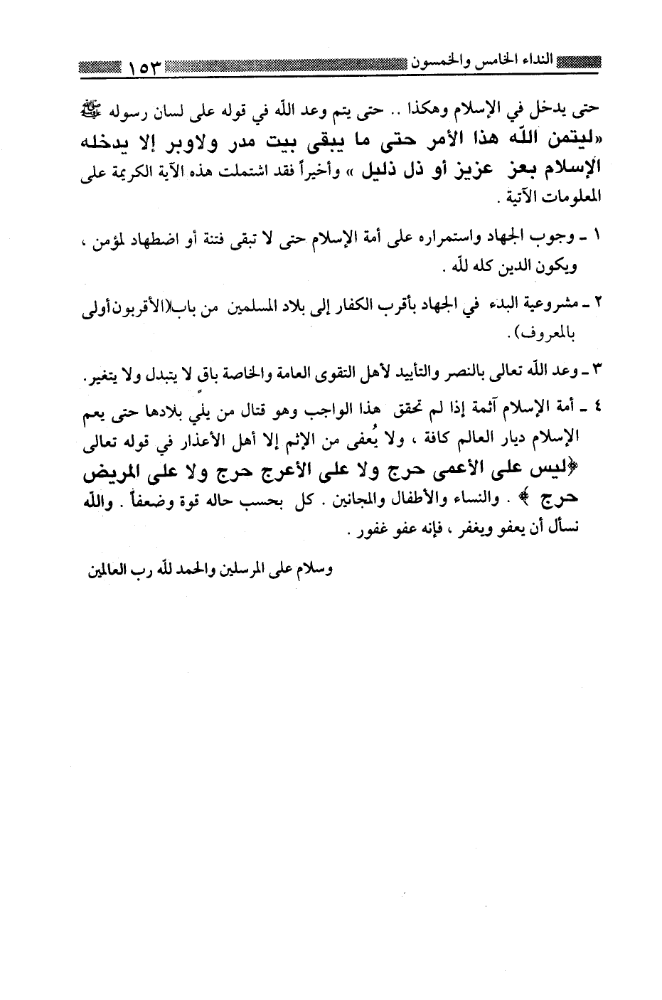 4-أمة الإسلام آثمة إذا لم تحقق هذا الواجب وهو قتال من يلي بلادها حتى يعم الإسلام ديار العالم كافة، ولا يعفى من الإثم إلا أهل الأعذار في قوله تعالى: {لَيْسَ عَلَى الْأَعْمَى حَرَجٌ وَلا عَلَى الْأَعْرَجِ حَرَجٌ وَلا عَلَى الْمَرِيضِ} والنساء والأطفال والمجانين، كل بحسب حاله قوة وضعفا. والله نسأل أن يعفو ويغفر، فإنه عفو غفور.