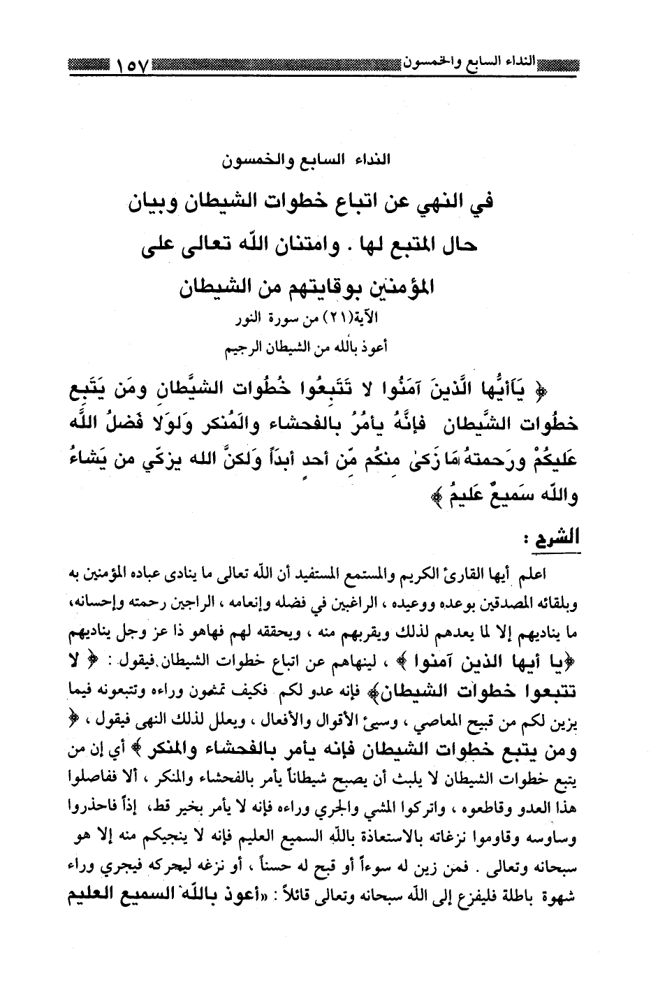 النداء السابع والخمسون: في النهى عن اتباع خطوات الشيطان وبيان حال المتبع لها. وامتنان الله تعالى على المؤمنين بوقايتهم من الشيطان.