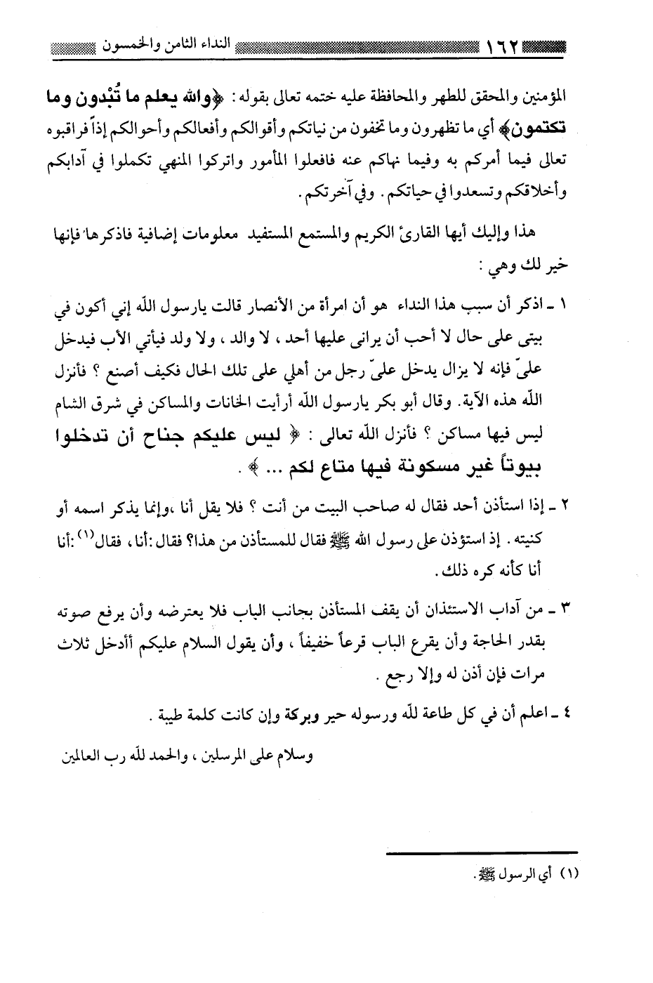 1-اذكر أن سبب هذا النداء هو أن امرأة من الأنصار قالت يا رسول الله إنى أكون في بيتي على حال لا أحب أن يراني عليها أحد، لا والد، ولا ولد فيأتي الأب فيدخل على فإنه لا يزال يدخل على رجل من أهلي على تلك الحال فكيف أصنع؟ فأنزل الله هذه الآية. وقال أبو بكر يا رسول الله أرأيت الخانات والمساكن في شرق الشام ليس فيها مساكن؟ فأنزل الله تعالى: {لَيْسَ عَلَيْكُمْ جُنَاحٌ أَنْ تَدْخُلُوا بُيُوتاً غَيْرَ مَسْكُونَةٍ فِيهَا مَتَاعٌ لَكُمْ ... } .