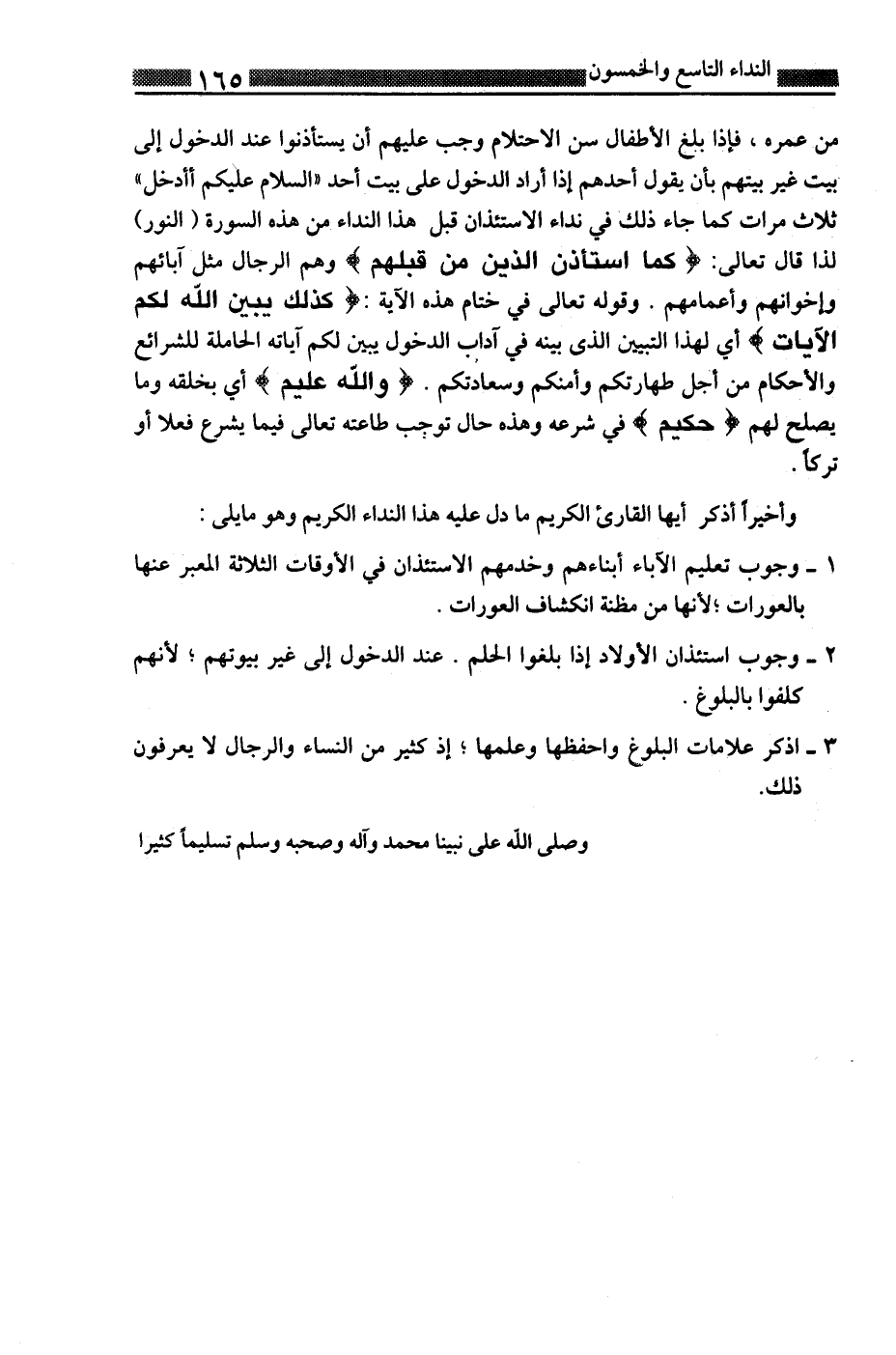 2-وجوب استئذان الأولاد إذا بلغوا الحلم. عند الدخول إلى غير بيوتهم؛ لأنهم كلفوا بالبلوغ.