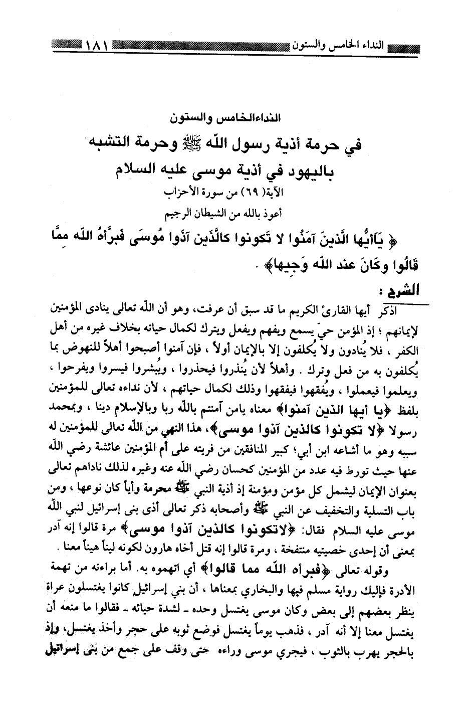 النداء الخامس والستون: في حرمة أذية رسول الله صلى الله عليه وسلم وحرمة التشبه باليهود في أذية موسى عليه السلام