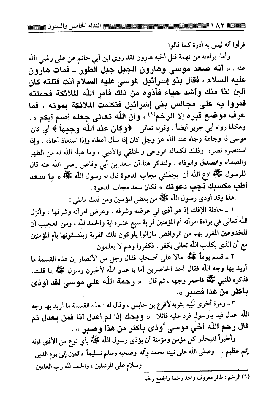 وأما براءته من تهمة قتل أخيه هارون فقد روى ابن أبى حاتم عن على رضى الله عنه. " أنه صعد موسى وهارون الجبل جبل الطور – فمات هارون عليه السلام، فقال بنو إسرائيل لموسى عليه السلام أنت قتلته كان ألين لنا منك وأشد حياء فآذوه من ذلك فأمر الله الملائكة فحملته فمروا به على مجالس بنى إسرائيل فتكلمت الملائكة بموته، فما عرف موضع قبره إلا الرخم1، وأن الله تعالى جعله أصم أبكم ". وهكذا رواه أبى جرير أيضا. وقوله تعالى: {وَكَانَ عِنْدَ اللَّهِ وَجِيهاً} أي كان موسى ذا وجاهة وجاه عند الله عز وجل كان إذا سأل أعطاه وإذا استعاذ أعاذه، وإذا استنصره نصره وذلك لكماله الروحي والخلقي والأدبي، وما هيأه الله له من الطهر والصفاء والصدق والوفاء. ولنذكر هنا أن سعد بن أبى وقاص رضى الله عنه قال للرسول صلى الله عليه سلم ادع الله أن يجعلني مجاب الدعوة قال له رسول الله صلى الله عليه سلم " يا سعد أطب مكسبك تجب دعوتك " فكان سعد مجاب الدعوة.