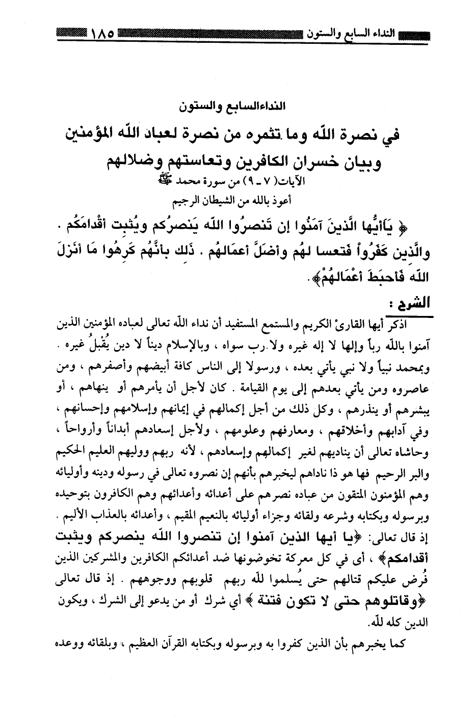 اذكر أيها القارئ الكريم والمستمع المستفيد أن نداء الله تعالى لعباده المؤمنين الذين آمنوا بالله ربا وإلها لا إله غيره ولا رب سواه، وبالإسلام دينا لا دين يقبل غيره، وبمحمد نبيا ولا نبي يأتى بعده، ورسولا إلى الناس كافة أبيضهم وأصفرهم، ومن عاصروه ومن يأتى بعدهم إلى يوم القيامة. كان لأجل أن يأمرهم أو ينهاهم، أو يبشرهم أو ينذرهم، وكل ذلك من أجل إكمالهم في إيمانهم وإسلامهم وإحسانهم، وفى آدابهم وأخلاقهم، ومعارفهم وعلومهم، ولأجل إسعادهم أبدانا وأرواحا، وحاشاه تعالى أن يناديهم لغير إكمالهم وإسعادهم، لأنه ربهم ووليهم العليم الحكيم والبر الرحيم فها هو ذا ناداهم ليخبرهم بأنهم إن نصروه تعالى في رسوله ودينه وأوليائه وهم المؤمنون المتقون من عباده نصرهم على أعدائه وأعدائهم وهم الكافرون بتوحيده وبرسوله وبكتابه وشرعه ولقائه وجزاء أوليائه بالنعيم المقيم، وأعدائه بالعذاب الأليم. إذ قال تعالى: {يَا أَيُّهَا الَّذِينَ آمَنُوا إِنْ تَنْصُرُوا اللَّهَ يَنْصُرْكُمْ وَيُثَبِّتْ أَقْدَامَكُمْ} ، أي في كل معركة تخوضونها ضد أعدائكم الكافرين والمشركين الذين فرض عليكم قتالهم حتى يسلموا لله قلوبهم ووجوههم. إذ قال تعالى: {وَقَاتِلُوهُمْ حَتَّى لا تَكُونَ فِتْنَةٌ} أي شرك أو من يدعو إلى الشرك، ويكون الدين كله لله.