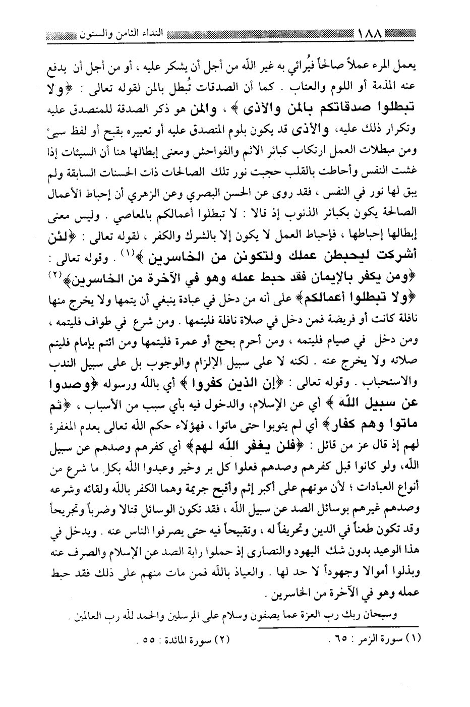 يعمل المرء عملا صالحا فيرائي به غير الله من أجل أن يشكر عليه، أو من أجل أن يدفع عنه المذمة أو اللوم والعتاب. كما أن الصدقات تبطل بالمن لقوله تعالى: {لا تُبْطِلُوا صَدَقَاتِكُمْ بِالْمَنِّ وَالْأَذَى} ، والمن هو ذكر الصدقة للمتصدق عليه وتكرار ذلك عليه، والأذى قد يكون بلوم المتصدق عليه أو تعييره بقبح أو لفظ سيئ ومن مبطلات العمل ارتكاب كبائر الإثم والفواحش ومعنى إبطالها أن السيئات إذا غشت النفس وأحاطت بالقلب حجبت نور تلك الصالحات ذات الحسنات السابقة ولم يبق لها نور في النفس، فقد روى عن الحسن البصري وعن الزهري أن إحباط الأعمال الصالحة يكون بكبائر الذنوب إذ قلا: لا تبطلوا أعمالكم بالمعاصي. وليس معنى إبطالها إحباطها، فإحباط العمل لا يكون إلا بالشرك والكفر، لقوله تعالى: {لَئِنْ أَشْرَكْتَ لَيَحْبَطَنَّ عَمَلُكَ وَلَتَكُونَنَّ مِنَ الْخَاسِرِينَ} 1. وقوله تعالى: {وَمَنْ يَكْفُرْ بِالْأِيمَانِ فَقَدْ حَبِطَ عَمَلُهُ وَهُوَ فِي الْآخِرَةِ مِنَ الْخَاسِرِينَ} 2 {وَلا تُبْطِلُوا أَعْمَالَكُمْ} على انه من دخل في عبادة ينبغي أن يتمها ولا يخرج منها نافلة كانت أو فريضة فمن دخل في صلاة نافلة فليتمها. ومن شرع في طواف فليتمه، ومن دخل في صيام فليتمه، ومن أحرم بحج أو عمرة فليتمها ومن ائتم بإمام فليتم صلاته ولا يخرج عنه. لكنه لا على سبيل الإلزام والوجوب بل على سبيل الندب والاستحباب،. وقوله تعالى: {إِنَّ الَّذِينَ كَفَرُوا} أي بالله ورسوله {وَصَدُّوا عَنْ سَبِيلِ اللَّهِ} أي عن الإسلام، والدخول فيه بأي سبب من الأسباب، {ثُمَّ مَاتُوا وَهُمْ كُفَّارٌ} أي لم يتوبوا حتى ماتوا، فهؤلاء حكم الله تعالى بعدم المغفرة لهم إذ قال عز من قائل: {فَلَنْ يَغْفِرَ اللَّهُ لَهُمْ} أي كفرهم وصدهم عن سبيل الله، ولو كانوا قبل كفرهم وصدهم فعلوا كل بر وخير وعبدوا الله بكل ما شرع من أنواع العبادات؛ لأن موتهم على أكبر إثم وأقبح جريمة وهما الكفر بالله ولقائه وشرعه وصدهم غيرهم بوسائل الصد عن سبيل الله، فقد تكون الوسائل قتالا وضربا وتجريحا وقد تكون طعنا في الدين وتحريفا له، وتقبيحا فيه حتى يصرفوا الناس عنه. ويدخل في هذا الوعيد بدون شك اليهود والنصارى إذ حملوا راية الصد عن الإسلام والصرف عنه وبذلوا أموالا وجهودا لا حد لها. والعياذ بالله فمن مات منهم على ذلك فقد حبط عمله وهو في الآخرة من الخاسرين.