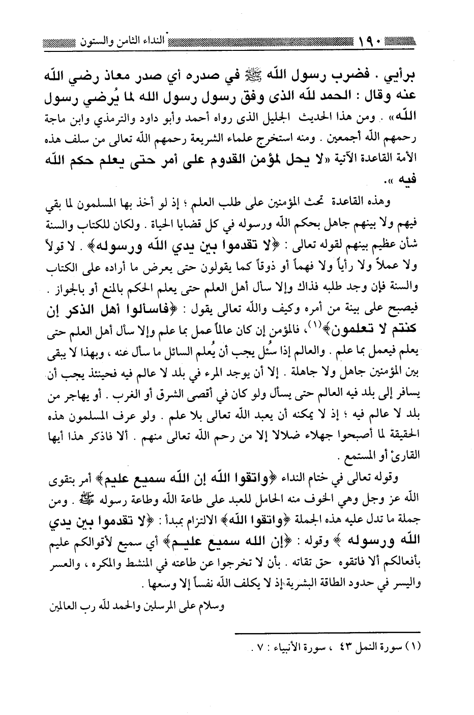 برأيي. فضرب رسول الله صلى الله عليه وسلم في صدره أي صدر معاذ رضى الله عنه وقال: الحمد لله الذي وفق رسول رسول الله ". ومن هذا الحديث الجليل الذي رواه أحمد وأبو داود والترمذى وابن ماجة رحمهم الله أجمعين. ومنه استخرج علماء الشريعة رحمهم الله تعالى من سلف هذه الأمة القاعدة الآتية " لا يحل لمؤمن القدوم على أمر حتى يعلم حكم الله فيه ".