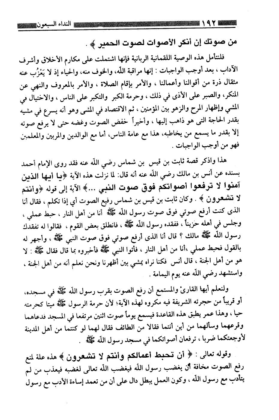هذا واذكر قصة ثابت بن قيس بن شماس رضى الله عنه فقد روى الإمام أحمد بسنده عن أنس بن مالك رضى الله عنه أنه قال: لما نزلت هذه الآية {يَا أَيُّهَا الَّذِينَ آمَنُوا لا تَرْفَعُوا أَصْوَاتَكُمْ فَوْقَ صَوْتِ النَّبِيِّ....} الآية إلى قوله {وَأَنْتُمْ لا تَشْعُرُونَ} . وكان ثابت بن قيس بن شماس رفيع الصوت أي إذا تكلم، فقال أنا الذي كنت أرفع صوتي فوق صوت رسول الله صلى الله عليه وسلم أنا من أهل النار. حبط عملي، وجلس في أهله حزينا، ففقده رسول الله صلى الله عليه وسلم، فانطلق بعض القوم، فقالوا له تفقدك رسول الله صلى الله عليه وسلم مالك؟ قال أنا الذي أرفع صوتي فوق صوت النبي صلى الله عليه وسلم، وأجهر له بالقول فحبط عملي، أنا من أهل النار، فأتوا النبي صلى الله عليه وسلم فأخبروه بما قال فقال صلى الله عليه وسلم: " لا هو من أهل الجنة"، قال أنس فكنا نراه يمشى بين أظهرنا ونحن نعلم أنه من أهل الجنة، واستشهد رضى الله عنه يوم اليمامة.