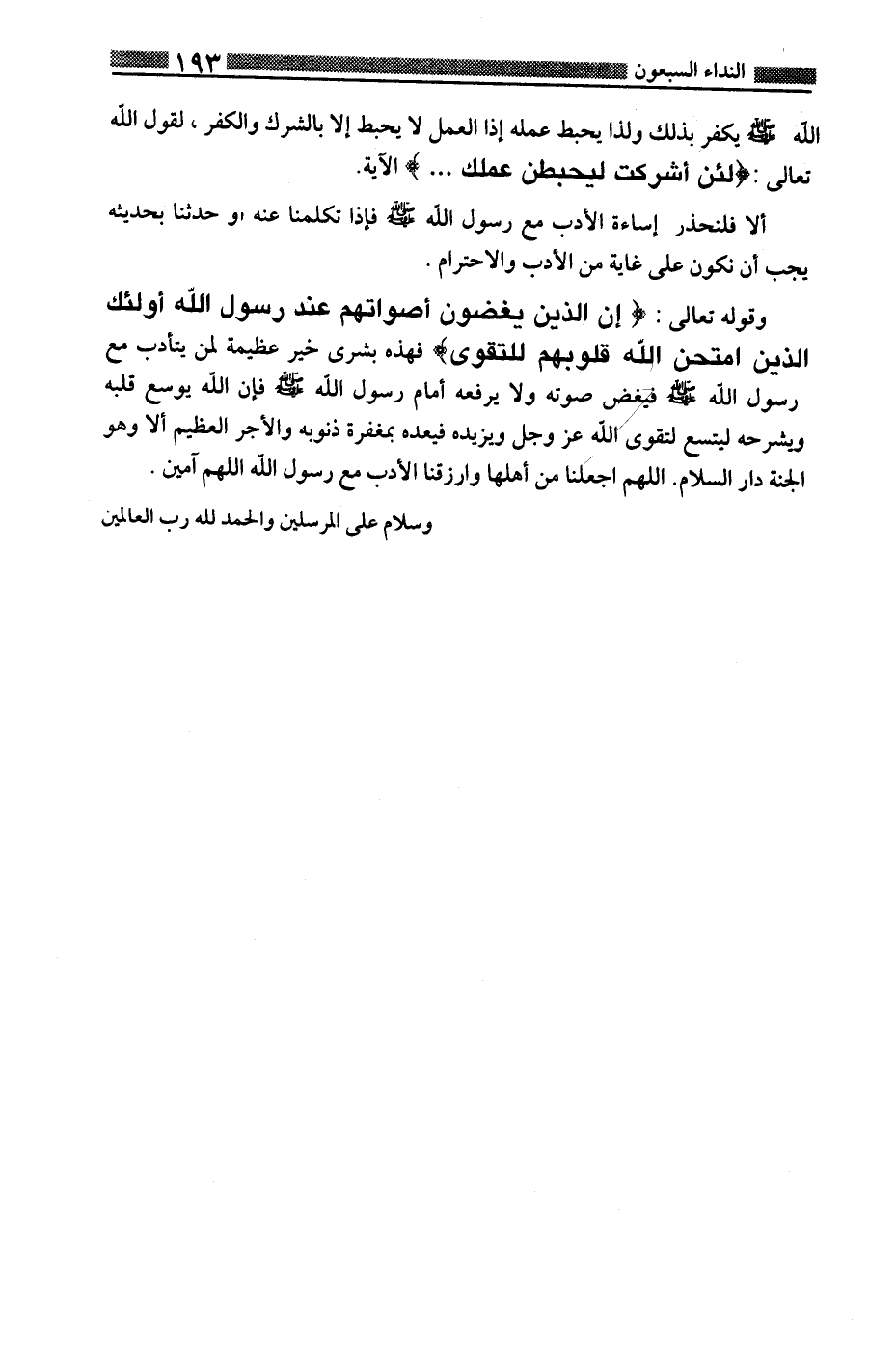 ألا فلنحذر إساءة الأدب مع رسول الله صلى الله عليه وسلم فإذا تكلمنا عنه وحدثنا بحديثه يجب أن تكون على غاية من الأدب والاحترام.