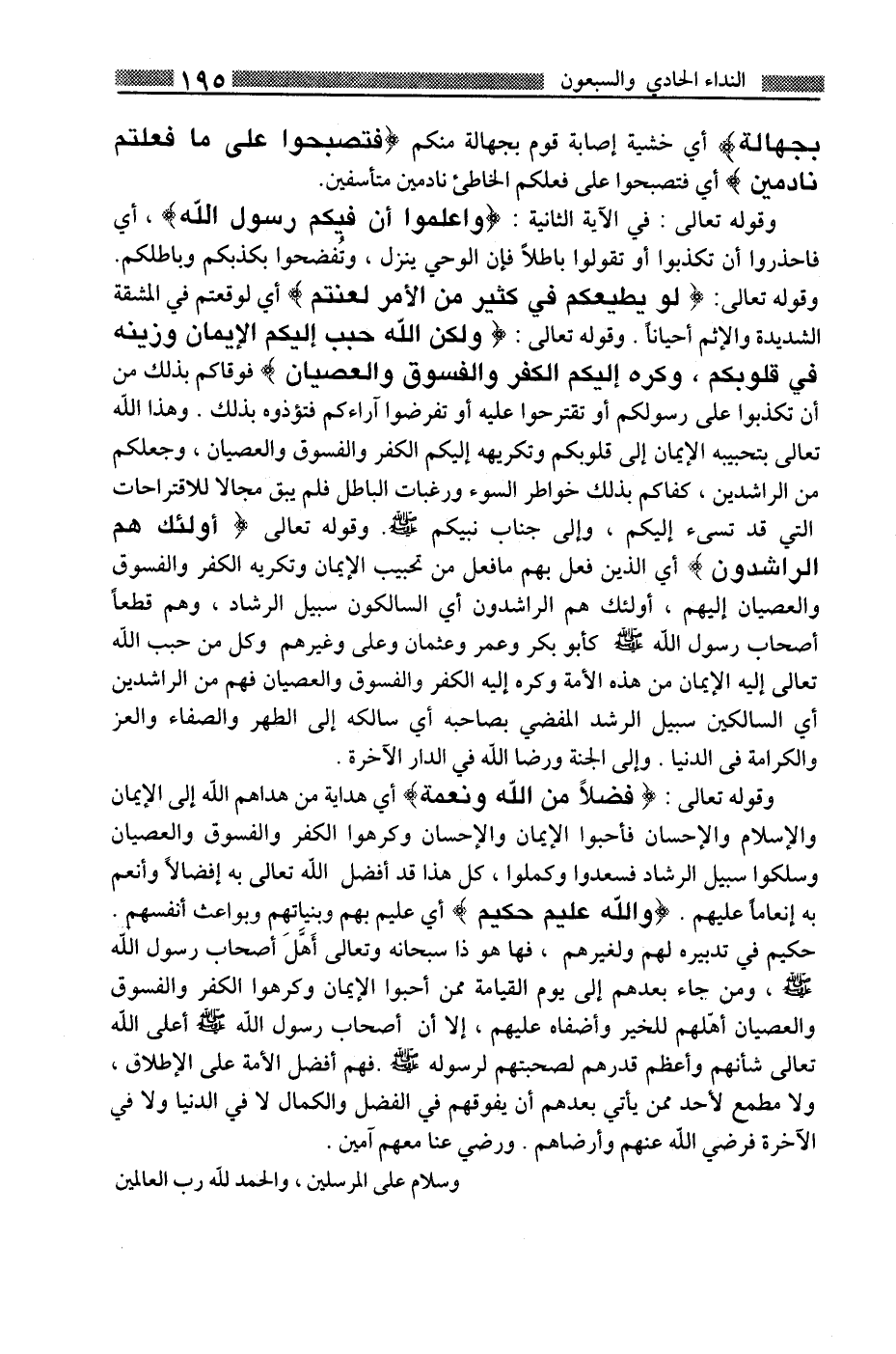 وقوله تعالى: في الآية الثانية: {وَاعْلَمُوا أَنَّ فِيكُمْ رَسُولَ اللَّهِ} ، أي فاحذروا أن تكذبوا أو تقولوا باطلا فإن الوحي ينزل، وتفضحوا بكذبكم وباطلكم. وقوله تعالى: {لَوْ يُطِيعُكُمْ فِي كَثِيرٍ مِنَ الْأَمْرِ لَعَنِتُّمْ} أي لوقعتم في المشقة الشديدة والإثم أحيانا. وقوله تعالى: {وَلَكِنَّ اللَّهَ حَبَّبَ إِلَيْكُمُ الْأِيمَانَ وَزَيَّنَهُ فِي قُلُوبِكُمْ وَكَرَّهَ إِلَيْكُمُ الْكُفْرَ وَالْفُسُوقَ وَالْعِصْيَانَ} فوقاكم بذلك من أن تكذبوا على رسولكم أو تقترحوا عليه أو تفرضوا آرائكم فتؤذوه بذلك، وهذا الله تعالى بتحبيبه الإيمان إلى قلوبكم وتكريهه إليكم الكفر والفسوق والعصيان، وجعلكم من الراشدين، كفاكم بذلك خواطر السوء ورغبات الباطل فلم يبق مجالا للاقتراحات التي قد تسئ إليكم، وإلى جناب نبيكم صلى الله عليه وسلم. وقوله تعالى: {أُولَئِكَ هُمُ الرَّاشِدُونَ} أي الذين فعل بهم ما فعل من تحبيب الإيمان وتكريه الكفر والفسوق والعصيان إليهم، أولئك هم الراشدون أي السالكون سبيل الرشاد، وهم قطعا أصحاب رسول الله صلى الله عليه وسلم كأبو بكر وعمر وعثمان وعلى غيرهم وكل من حبب الله إليه تعالى الإيمان من هذه الأمة وكره إليه الكفر والفسوق والعصيان فهم من الراشدين أي السالكين سبيل الرشد المفضى بصاحبه أي سالكه إلى الطهر والصفاء والعز والكرامة في الدنيا. وإلى الجنة ورضا الله في الدار الآخرة.