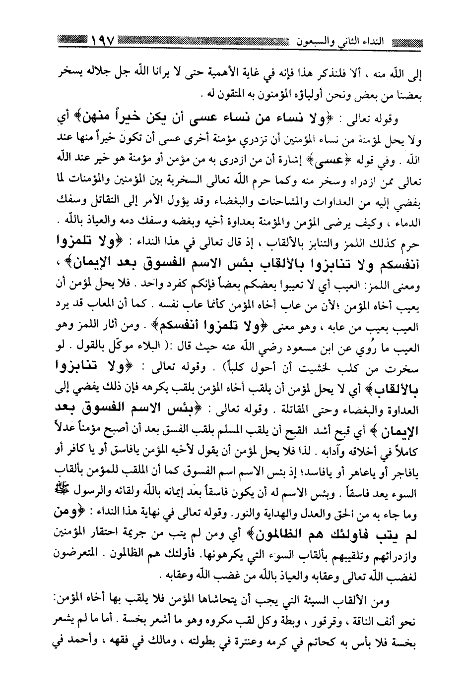 وقوله تعالى: {وَلا نِسَاءٌ مِنْ نِسَاءٍ عَسَى أَنْ يَكُنَّ خَيْراً مِنْهُنَّ} أي ولا يحل لمؤمنة من نساء المؤمنين أن تزدرى مؤمنة أخرى عسى أن تكون خيرا منها عند الله. وفى قوله {عَسَى} إشارة أن من ازدرى به من مؤمن أو مؤمنة هو خير عند الله تعالى ممن ازدراه وسخر منه وكما حرم الله تعالى السخرية بين المؤمنين والمؤمنات لما يفضى إليه من العداوات والمشاحنات والبغضاء وقد يؤول الأمر إلى التقاتل وسفك الدماء، وكيف يرضى المؤمن والمؤمنة بعداوة أخيه وبغضه وسفك دمه والعياذ بالله. حرم كذلك اللمز والتنابز بالألقاب، إذ قال تعالى في هذا النداء: {وَلا تَلْمِزُوا أَنْفُسَكُمْ وَلا تَنَابَزُوا بِالْأَلْقَابِ بِئْسَ الِاسْمُ الْفُسُوقُ بَعْدَ الْأِيمَانِ} ، ومعنى اللمز: العيب أي لا تعيبوا بعضكم بعضا فإنكم كفرد واحد. فلا يحل لمؤمن أن يعيب أخاه المؤمن؛ لأن من عاب أخاه المؤمن كأنما عاب نفسه. كما أن المعاب قد يرد العيب بعيب من عابه، وهو معنى {وَلا تَلْمِزُوا أَنْفُسَكُمْ} . ومن آثار اللمز وهو العيب ما روى عن ابن مسعود رضى الله عنه حيث قال: " البلاء موكل بالقول، لو سخرت من كلب لخشيت أن أحول كلبا ". وقوله تعالى: {وَلا تَنَابَزُوا بِالْأَلْقَابِ} أي لا يحل لمؤمن أن يلقب أخاه المؤمن بلقب يكرهه فإن ذلك يفضى إلى العداوة والبغضاء وحتى المقاتلة. وقوله تعالى: {بِئْسَ الِاسْمُ الْفُسُوقُ بَعْدَ الْأِيمَانِ} أي قبح أشد القبح أن يلقب المسلم بلقب الفسق بعد أن أصبح مؤمنا عدلا كاملا في أخلاقه وآدابه. لذا فلا يحل لمؤمن أن يقول لأخيه المؤمن يا فاسق أو يا كافر أو يا فاجر أو يا عاهر أو يا فاسد؛ إذ بئس الاسم اسم الفسوق كما أن الملقب للمؤمن بالألقاب السوء يعد فاسقا. وبئس الاسم له أن يكون فاسقا بعد إيمانه بالله ولقائه والرسول صلى الله عليه وسلم وما جاء به من الحق والعدل والهداية والنور. وقوله تعالى في نهاية هذا النداء: {وَمَنْ لَمْ يَتُبْ فَأُولَئِكَ هُمُ الظَّالِمُونَ} أي ومن لم يتب من جريمة احتقار المؤمنين وازدرائهم وتلقيبهم بألقاب السوء التي يكرهونها. فأولئك هم الظالمون. المتعرضون لغضب الله تعالى وعقابه والعياذ بالله من غضب الله وعقابه.