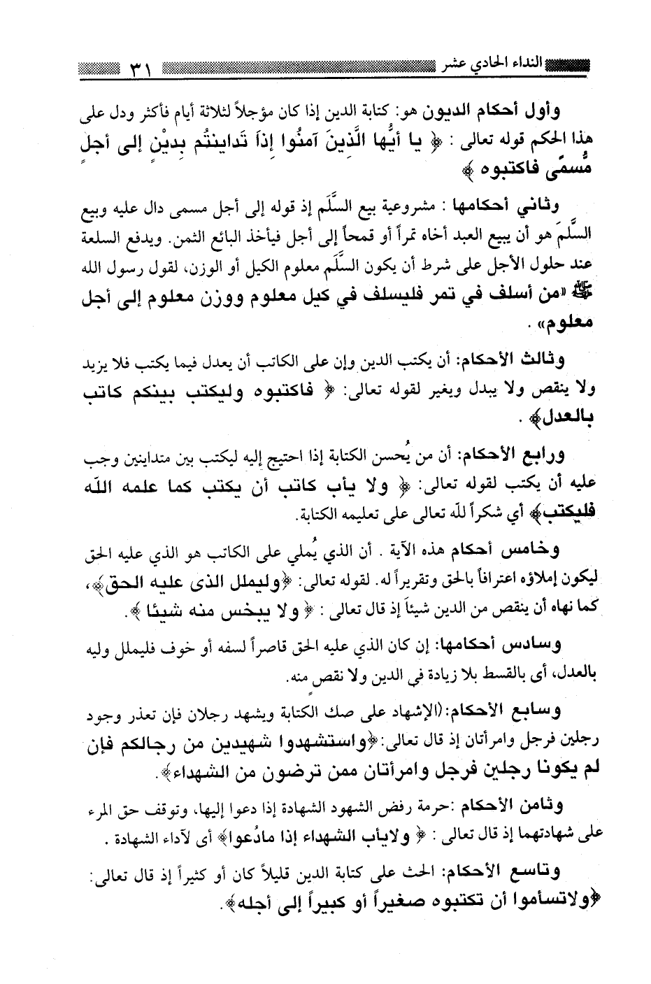 وتاسع الأحكام: الحث على كتابة الدين قليلا كان أو كثير إذ قال الله تعالى: {وَلا تَسْأَمُوا أَنْ تَكْتُبُوهُ صَغِيراً أَوْ كَبِيراً إِلَى أَجَلِهِ}