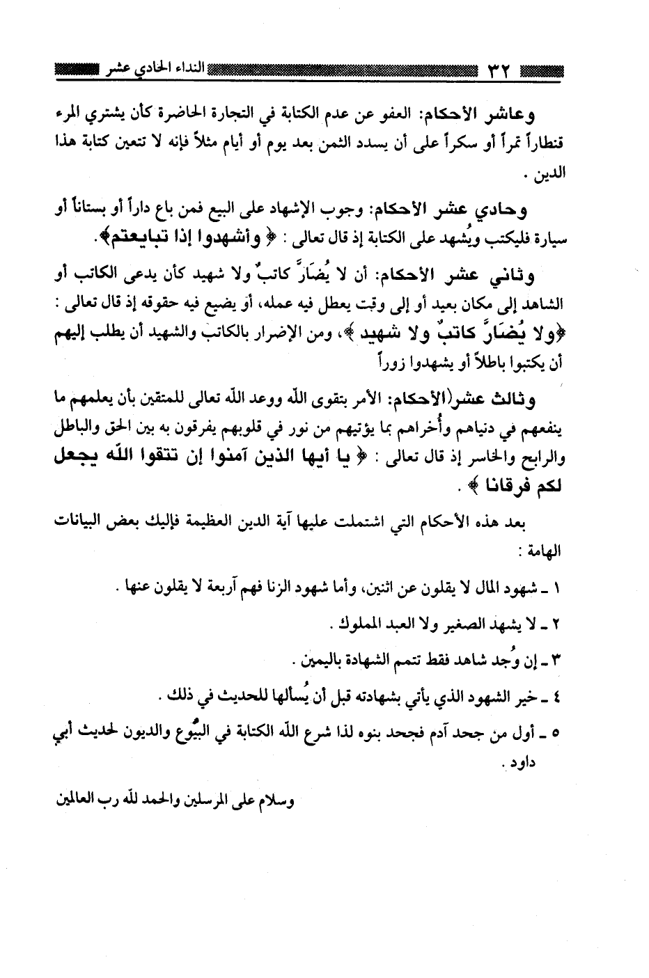وحادي عشر الأحكام: وجوب الإشهاد على البيع فمن باع دارا أو بستانا أو سيارة فليكتب ويشهد على الكتابة إذ قال تعالى: {وَأَشْهِدُوا إِذَا تَبَايَعْتُمْ}
