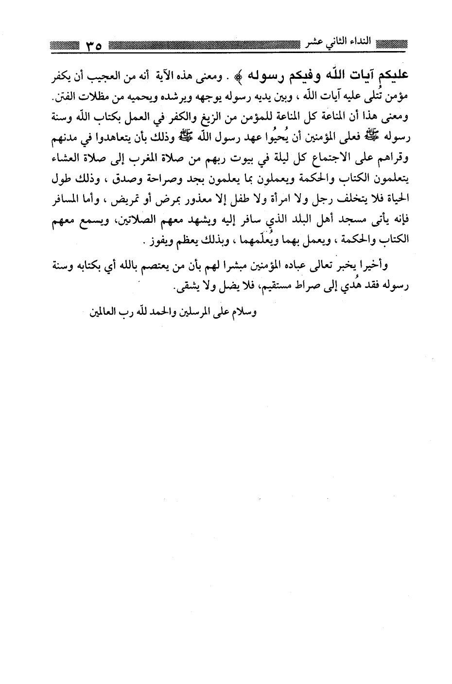 عَلَيْكُمْ آيَاتُ اللَّهِ وَفِيكُمْ رَسُولُهُ} . ومعنى هذه الآية أنه من العجيب أن يكفر مؤمن تتلى عليه آيات الله، وبين يديه رسوله يوجهه ويرشده ويحميه من مظلات الفتن. ومعنى هذا أن المناعة كل المناعة للمؤمن من الزيغ والكفر في العمل بكتاب الله وسنة رسوله صلى الله عليه وسلم فعلى المؤمنين أن يحيوا عهد رسول الله صلى الله عليه وسلم وذلك بأن يتعاهدوا في مدنهم وقراهم على الاجتماع كل ليلة في بيوت ربهم من صلاة المغرب إلى صلاة العشاء يتعلمون الكتاب والحكمة ويعملون بما يعلمون بجد وصراحة وصدق، وأما المسافر فإنه يأتى مسجد أهل البلد الذي سافر إليه ويشهد معهم الصلاتين، ويسمع معهم الكتاب والحكمة، ويعمل بهما ويعلمهما، وبذلك يعظم ويفوز.