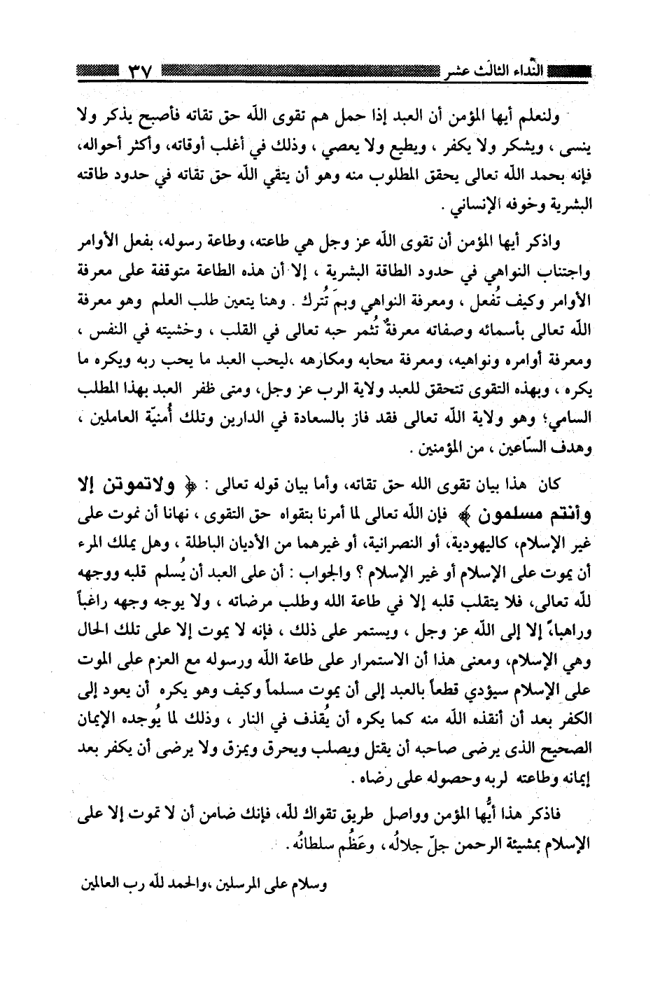 فاذكر هذا أيها المؤمن وواصل طريق تقواك لله، فإنك ضامن أن لا تموت إلا على الإسلام بمشيئة الرحمن جل جلاله، وعظم سلطانه.