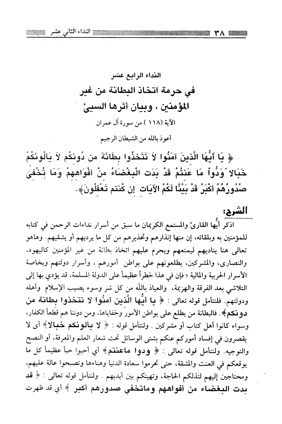 اذكر أيها القارئ والمستمع الكريمان ما سبق من أسرار نداءات الرحمن في كتابه للمؤمنين به وبلقائه، إن منها إنذارهم وتحذيرهم من كل ما يرديهم أو يشقيهم. وها هو تعالى هنا يناديهم ليمنعهم ويحرم عليهم اتخاذ بطانة من غير المؤمنين كاليهود، والنصارى، والمشركين، يطلعونهم على بواطن أمورهم، وأسرار دولتهم وبخاصة الأسرار الحربية والمالية، فإن في هذا خطرا عظيما على الدولة المسلمة، وقد يؤدى بها إلى التلاشي بعد الفرقة والهزيمة، والعياذ بالله من كل شر وسوء يصيب الإسلام وأهله ودولتهم. فلنتأمل قوله تعالى: {يَا أَيُّهَا الَّذِينَ آمَنُوا لا تَتَّخِذُوا بِطَانَةً مِنْ دُونِكُمْ} فالبطانة من يطلع على بواطن الأمور وخفاياها، ومن دوننا هم قطعا الكفار، وسواء كانوا أهل كتاب أو مشركين، ولنتأمل قوله {لا يَأْلُونَكُمْ خَبَالاً} أي لا يقصرون في إفساد أموركم عنكم بشتى الوسائل تحت شعار العلم والمعرفة، أو النصح والتوجيه، ولنتأمل قوله تعالى: {وَدُّوا مَا عَنِتُّمْ} أي أحبوا حبا عظيما كل ما يوقعكم في العنت والمشقة، حتى تحرموا سعادة الدنيا وهناءها وتصبحوا عالة عليهم، ومحتاجين إليه لتذلكم الحاجة، وتهينكم بين أيديهم. ولنتأمل قوله تعالى: {قَدْ بَدَتِ الْبَغْضَاءُ مِنْ أَفْوَاهِهِمْ وَمَا تُخْفِي صُدُورُهُمْ أَكْبَرُ} أي قد ظهرت