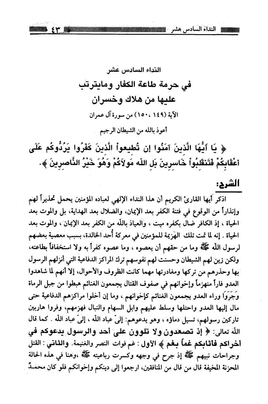 النداء السادس عشر: في حرمة طاعة الكفار وما يترتب عليها من هلاك وخسران