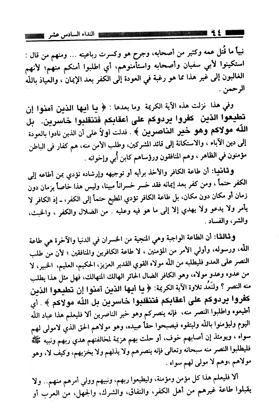 وثالثا: أن الطاعة الواجبة وهى المنجية من الخسران في الدنيا والآخرة هي طاعة الله، ورسوله، وأولى الأمر من المؤمنين، لا طاعة الكافرين والمنافقين؛ لأن من طلب النصر على العدو فليطلبه من الله مولاه القوى القدير العزيز، الحكيم، العليم، الخبير، لا من عدوه وعدو مولاه، وهو الكافر الضال الحائر الهالك المتهالك، فهل مثل هذا يطلب منه النصر؟ ولنعد تلاوة الآية الكريمة: {يَا أَيُّهَا الَّذِينَ آمَنُوا إِنْ تُطِيعُوا الَّذِينَ كَفَرُوا يَرُدُّوكُمْ عَلَى أَعْقَابِكُمْ فَتَنْقَلِبُوا خَاسِرِينَ بَلِ اللَّهُ مَوْلاكُمْ} . أي أطيعوه وأطلبوا النصر منه، فإنه ينصركم وهو خير الناصرين ألا فليعلم هذا عباد الله اليوم وليؤمنوا بالله وليتقوه فيصبحوا حقا عبيده، وهو مولاهم الحق الذي لا مولى لهم سواه، ويومئذ إن أصابهم خوف، أو حلت بهم هزيمة لمخالفتهم هدى ربهم ونبيه صلى الله عليه وسلم فليطلبوا النصر منه سبحانه وتعالى فإنه ينصرهم ولا يذلهم ولا يخزيه وهو مولاهم، وهم لا مولى لهم سواه.