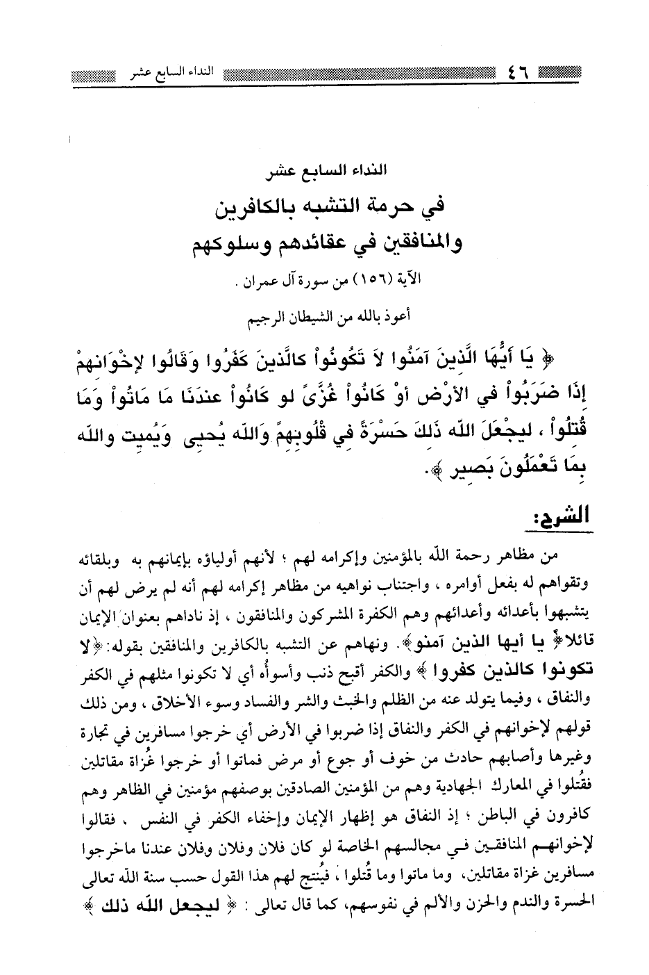 النداء السابع عشر: في حرمة التشبه بالكافرين والمنافقين في عقائدهم وسلوكهم