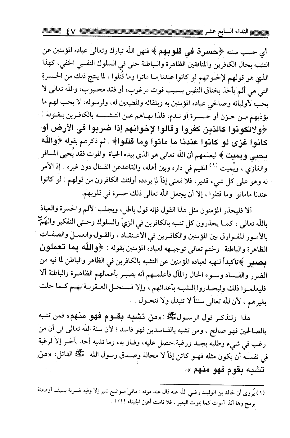 ألا فليحذر المؤمنون مثل هذا القول فإنه قول باطل، ويجلب الألم والحسرة والعياذ بالله تعالى، كما يحذرون كل تشبه بالكافرين في الزي والسلوك وحتى التفكير والهم بالأمور للفوارق بين المؤمنين والكافرين في الاعتقاد، والقول والعمل والصفات الظاهرة والباطنة. وختم تعالى توجيهه لعباده المؤمنين بقوله: {وَاللَّهُ بِمَا تَعْمَلُونَ بَصِيرٌ} تأكيدا لنهيه لعباده المؤمنين عن التشبه بالكافرين في الظاهر والباطن لما فيه من الضرر والفساد وسوء الحال والمآل فأعلمهم أنه بصير بأعمالهم الظاهرة والباطنة ألا فليعلموا ذلك وليحذروا التشبه بأعدائهم وإلا فستحل العقوبة بهم كما حلت بغيرهم، لأن لله تعالى سننا لا تتبدل ولا تتجول…