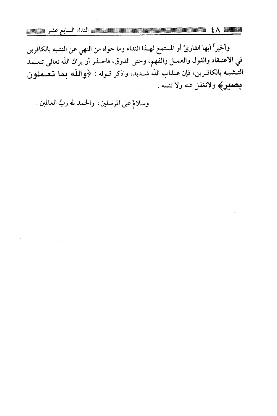 وأخيرا أيها القارئ أو المستمع لهذا النداء وما حواه من النهى عن التشبه بالكافرين في الاعتقاد والقول والعمل والفهم وحتى الذوق، فاحذر أن يراك الله تعالى تتعمد التشبه بالكافرين، فإن عذاب الله شديد، واذكر قوله: {وَاللَّهُ بِمَا تَعْمَلُونَ بَصِيرٌ} ولا تغفل عنه ولا تنسه.