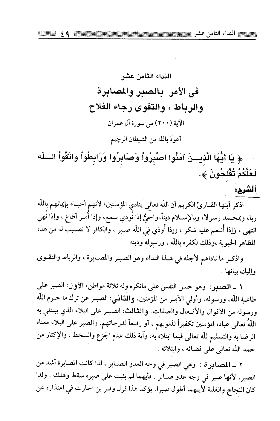 النداء الثامن عشر: في الأمر بالصبر والمصابرة والرباط، والتقوى رجاء الفلاح