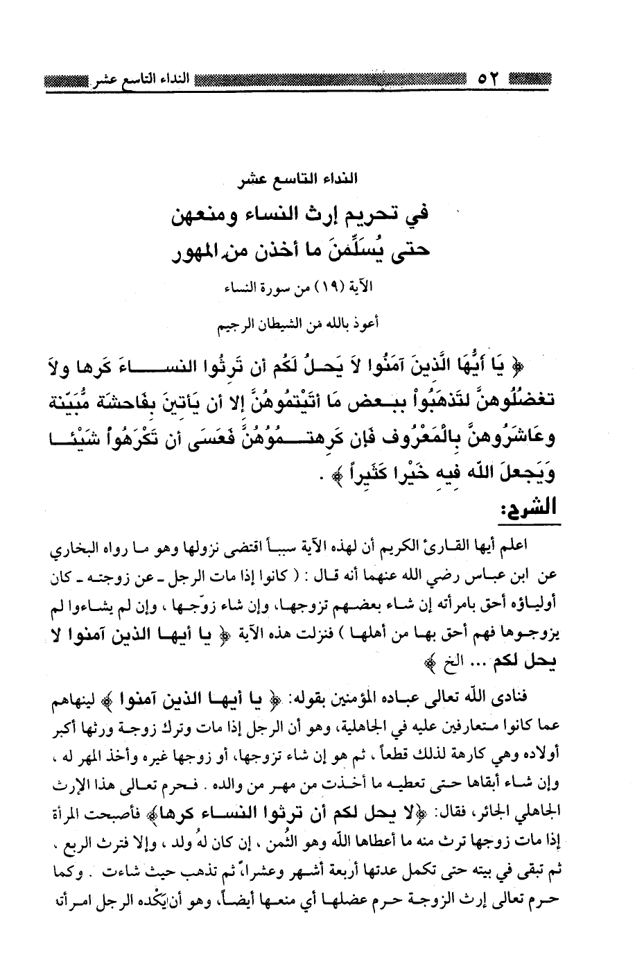 النداء التاسع عشر: في تحريم إرث النساء ومنعهن حتى يسلمن ما أخذن من المهور