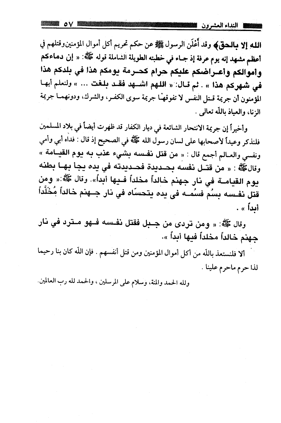 اللَّهُ إِلاَّ بِالْحَقِّ} وقد أعلن الرسول صلى الله عليه وسلم عن حكم تحريم أكل أموال المؤمنين وقتلهم في أعظم مشهد إنه يوم عرفة إذ جاء في خطبته الطويلة الشاملة قوله صلى الله عليه وسلم: " إن دماءكم وأموالكم وأعراضكم عليكم حرام كحرمة يومكم هذا في بلدكم هذا في شهركم هذا ". ثم قال: " اللهم اشهد فقد بلغت ... " ولنعلم أيها المؤمنون أن جريمة قتل النفس لا تفوقها جريمة سوى الكفر، والشرك، ودونهما جريمة الزنا، والعياذ بالله تعالى.