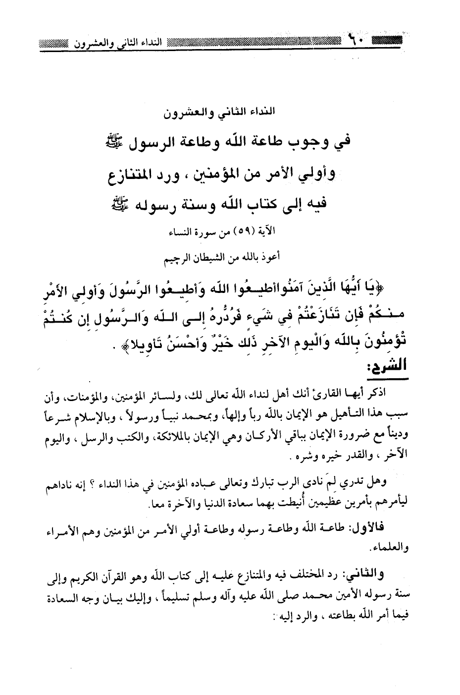 النداء الثاني العشرون: في وجوب طاعة الله وطاعة الرسول صلى الله عليه وسلم وأولى الأمر من المؤمنين، ورد المتنازع فيه إلى كتاب الله وسنة رسوله صلى الله عليه وسله
