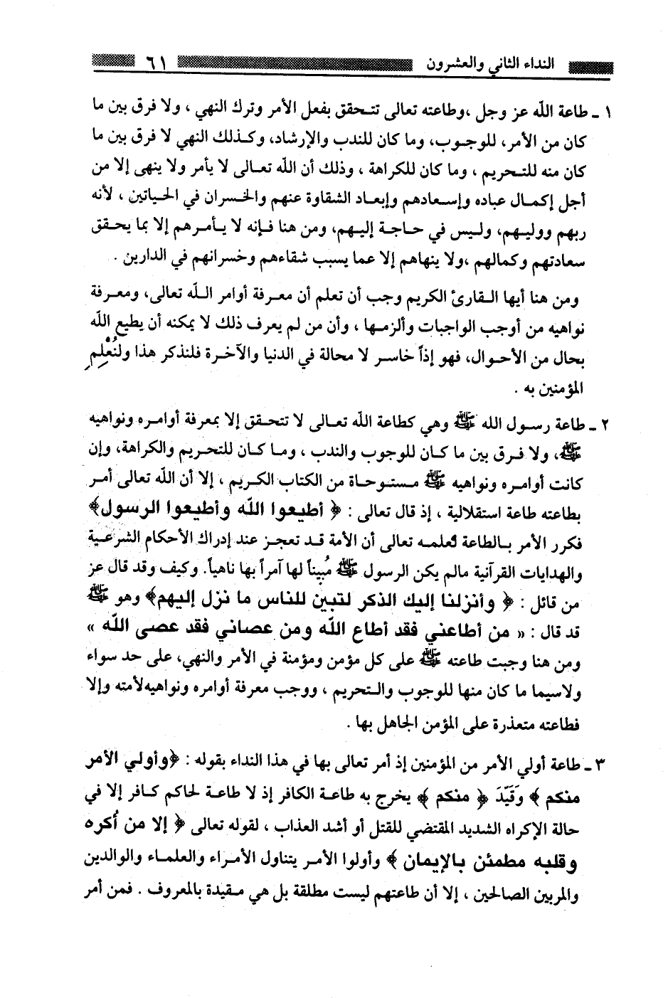 1-طاعة الله عز وجل، وطاعته تعالى تتحقق بفعل الأمر وترك النهى، ولا فرق بين ما كان من الأمر، للوجوب، وما كان للندب والإرشاد، وكذلك النهى لا فرق بين ما كان منه للتحريم وما كان للكراهة، وذلك أن الله تعالى لا يأمر ولا ينهى إلا من أجل إكمال عباده وإسعادهم وإبعاد الشقاوة عنهم والخسران في الحياتين، لأنه ربهم ووليهم وليس في حاجة إليهم، ومن هنا فإنه لا يأمرهم إلا بما يحقق سعادتهم وكمالهم، ولا ينهاهم إلا عما يسبب شقاؤهم وخسرانهم في الدارين.