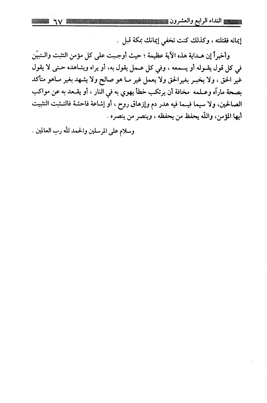 وأخيرا إن هداية هذه الآية عظيمة؛ حيث أوجبت على كل مؤمن التثبت والتبين في كل قول يقوله أو يسمعه، وفى كل عمل يقوم به، أو يراه ويشاهده حتى لا يقول غير الحق، ولا يخبر بغير الحق ولا يعمل غير ما هو صالح ولا يشهد بغير ما هو متأكد بصحة ما رآه وعلمه مخافة أن يرتكب خطأ يهوى به في النار، أو يقع به عن مواكب الصالحين، ولاسيما فيما فيه هدر دم وإزهاق روح، أو إشاعة فاحشة فالتثبت التثبيت أيها المؤمن، والله يحفظ من يحفظه، وينصر من ينصره.