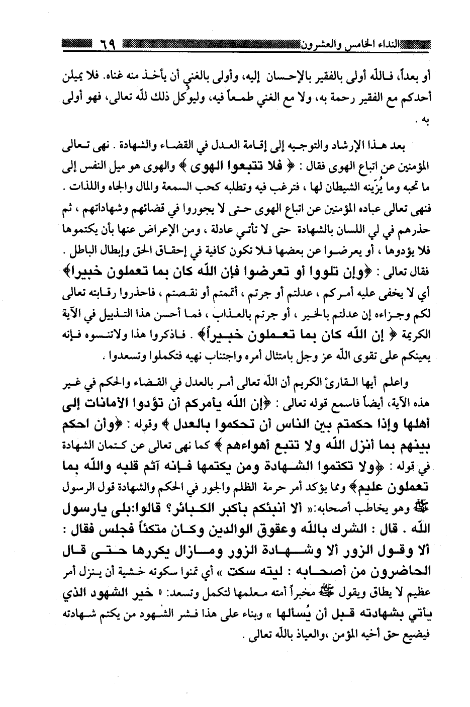 واعلم أيها القارئ الكريم أن الله تعالى أمر بالعدل في القضاء والحكم في غير هذه الآية، أيضا فاسمع قوله تعالى: {ِانَّ اللَّهَ يَأْمُرُكُمْ أَنْ تُؤَدُّوا الأَمَانَاتِ إِلَى أَهْلِهَا وَإِذَا حَكَمْتُمْ بَيْنَ النَّاسِ أَنْ تَحْكُمُوا بِالْعَدْلِ} وقوله: {وَأَنِ احْكُمْ بَيْنَهُمْ بِمَا أَنْزَلَ اللَّهُ وَلا تَتَّبِعْ أَهْوَاءَهُمْ} كما نهى تعالى عن كتمان الشهادة في قوله: {وَلا تَكْتُمُوا الشَّهَادَةَ وَمَنْ يَكْتُمْهَا فَإِنَّهُ آثِمٌ قَلْبُهُ وَاللَّهُ بِمَا تَعْمَلُونَ عَلِيمٌ} ومما يؤكد أمر حرمة الظلم والجور في الحكم والشهادة قول الرسول صلى الله عليه وسلم وهو يخاطب أصحابه: " ألا أنبئكم بأكبر الكبائر؟ قالوا: بلى يا رسول الله. قال: الشرك بالله وعقوق الوالدين وكان متكئا فجلس فقال: ألا وقول الزور ألا وشهادة الزور ومازال يكررها حتى قال الحاضرون من أصحابه: ليته سكت " أي تمنوا سكوته خشية أن ينزل أمر عظيم لا يطاق ويقول صلى الله عليه وسلم مخبرا أمته معلمها لتكمل وتسعد: " خير الشهود الذي يأتى بشهادته قبل أن يسألها " وبناء على هذا فشر الشهود من يكتم شهادته فيضيع حق أخيه المؤمن، والعياذ بالله تعالى.