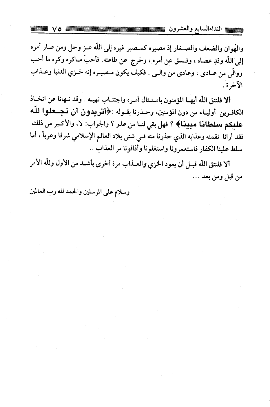 ألا فلنتق الله المؤمنون بامتثال أمره واجتناب نهيه. وقد نهانا عن اتخاذ الكافرين أولياء من دون المؤمنين، وحذرنا بقوله: {أَتُرِيدُونَ أَنْ تَجْعَلُوا لِلَّهِ عَلَيْكُمْ سُلْطَاناً مُبِيناً} ؟ فهل بقى لنا من عذر؟ والجواب: لا، والأكبر من ذلك فقد أرانا نقمته وعذابه الذي حذرنا منه في شتى بلاد العالم الإسلامي شرقا وغربا، أما سلط علينا الكفار فاستعمرونا واستغلونا وأذاقونا مر العذاب..