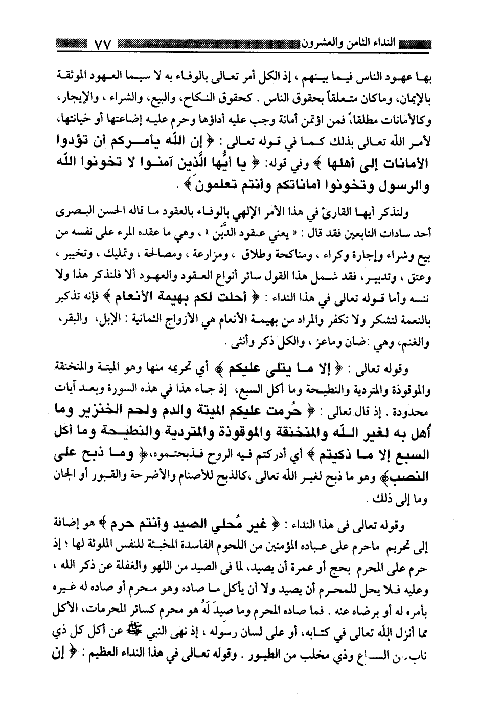 ولنذكر أيها القارئ في هذا الأمر الإلهي بالوفاء بالعقود ما قاله الحسن البصري أحد سادات التابعين فقد قال: " يعنى عقود الدين "، وهى ما عقد المرء على نفسه من بيع وشراء وإجارة وكراء، ومناكحة وطلاق، ومزارعة، ومصالحة، وتمليك، وتخيير، وعتق، وتدبير، فقد شمل هذا القول سائر أنواع العقود والعهود ألا فلنذكر هذا ولا ننسه وأما قوله تعالى في هذا النداء: {أُحِلَّتْ لَكُمْ بَهِيمَةُ الأَنْعَامِ} فإنه تذكير بالنعمة لتشكر ولا تكفر والمراد من بهيمة الأنعام هي الأزواج الثمانية: الإبل، والبقر، والغنم، وهى: ضان وماعز، والكل ذكر وأنثى.