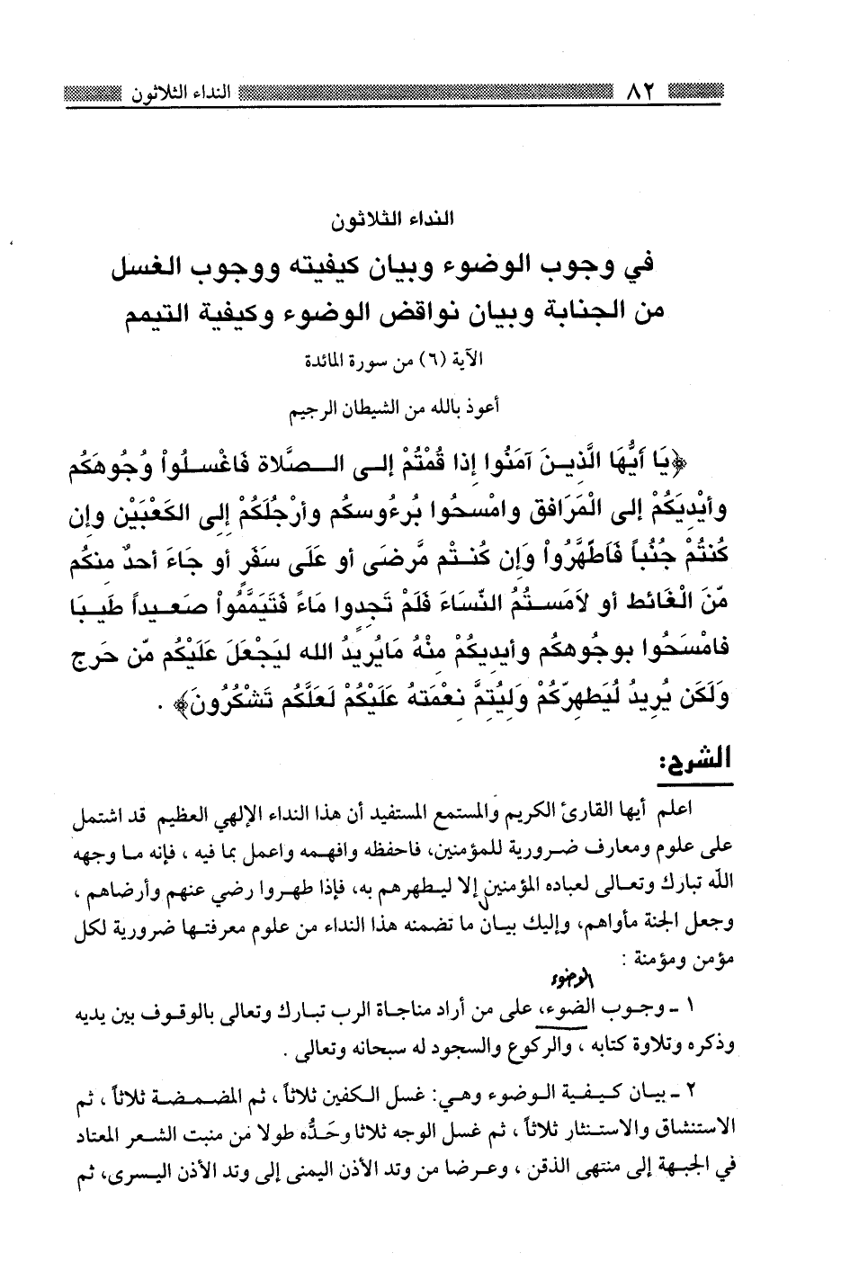 النداء الثلاثون: في وجوب الوضوء وبيان كيفيته ووجوب الغسل من الجنابة وبيان نواقض الوضوء وكيفية التيمم