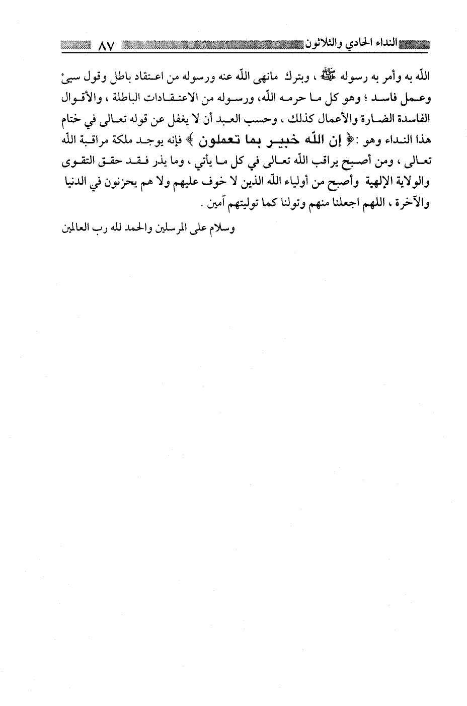 الله به وأمر به رسوله صلى الله عليه وسلم، وبترك ما نهى الله عنه ورسوله من اعتقاد باطل وقول سيئ وعمل فاسد؛ وهو كل ما حرمه الله، ورسوله من الاعتقادات الباطلة، والأقوال الفاسدة الضارة والأعمال كذلك، وحسب العبد أن لا يغفل عن قوله تعالى في ختام هذا النداء وهو: {إِنَّ اللَّهَ خَبِيرٌ بِمَا تَعْمَلُونَ} فإنه يوجد ملكة مراقبة الله تعالى، ومن أصبح يراقب الله تعالى في كل ما يأتى، وما يذر فقد حقق التقوى والولاية الإلهية وأصبح من أولياء الله الذين لا خوف عليهم ولا هم يحزنون في الدنيا والآخرة، اللهم اجعلنا منهم وتولنا كما توليتهم آمين.