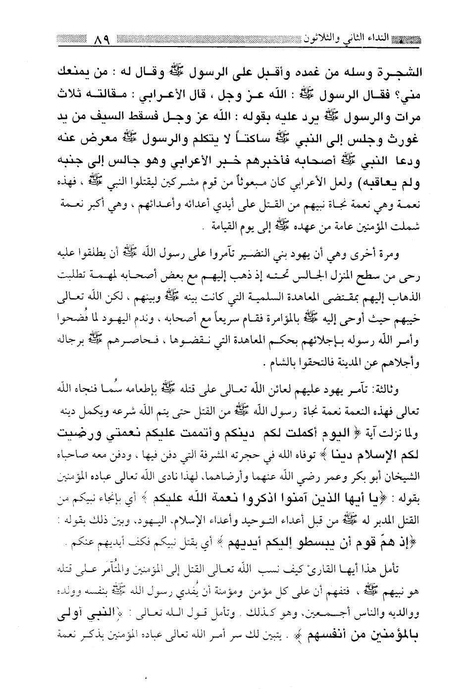الشجرة وسله من غمده وأقبل على الرسول صلى الله عليه وسلم وقال له: من يمنعك منى؟ فقال الرسول صلى الله عليه وسلم الله عز وجل، قال الأعرابي: مقالاته ثلاث مرات والرسول صلى الله عليه وسلم يرد عليه بقوله: الله عز وجل فسقط السيف من يد غورث وجلس إلى النبي صلى الله عليه وسلم ساكتا لا يتكلم والرسول صلى الله عليه وسلم معرض عنه ودعا النبي صلى الله عليه وسلم أصحابه فأخبرهم خبر الأعرابي وهو جالس إلى جنبه ولم يعاقبه ولعل الأعرابي كان مبعوثا من قوم مشركين ليقتلوا النبي صلى الله عليه وسلم، فهذه نعمة وهى نعمة نجاة نبيهم من القتل على أيدي أعدائه وأعدائهم، وهى أكبر نعمة شملت المؤمنين عامة من عهده صلى الله عليه وسلم إلى يوم القيامة.